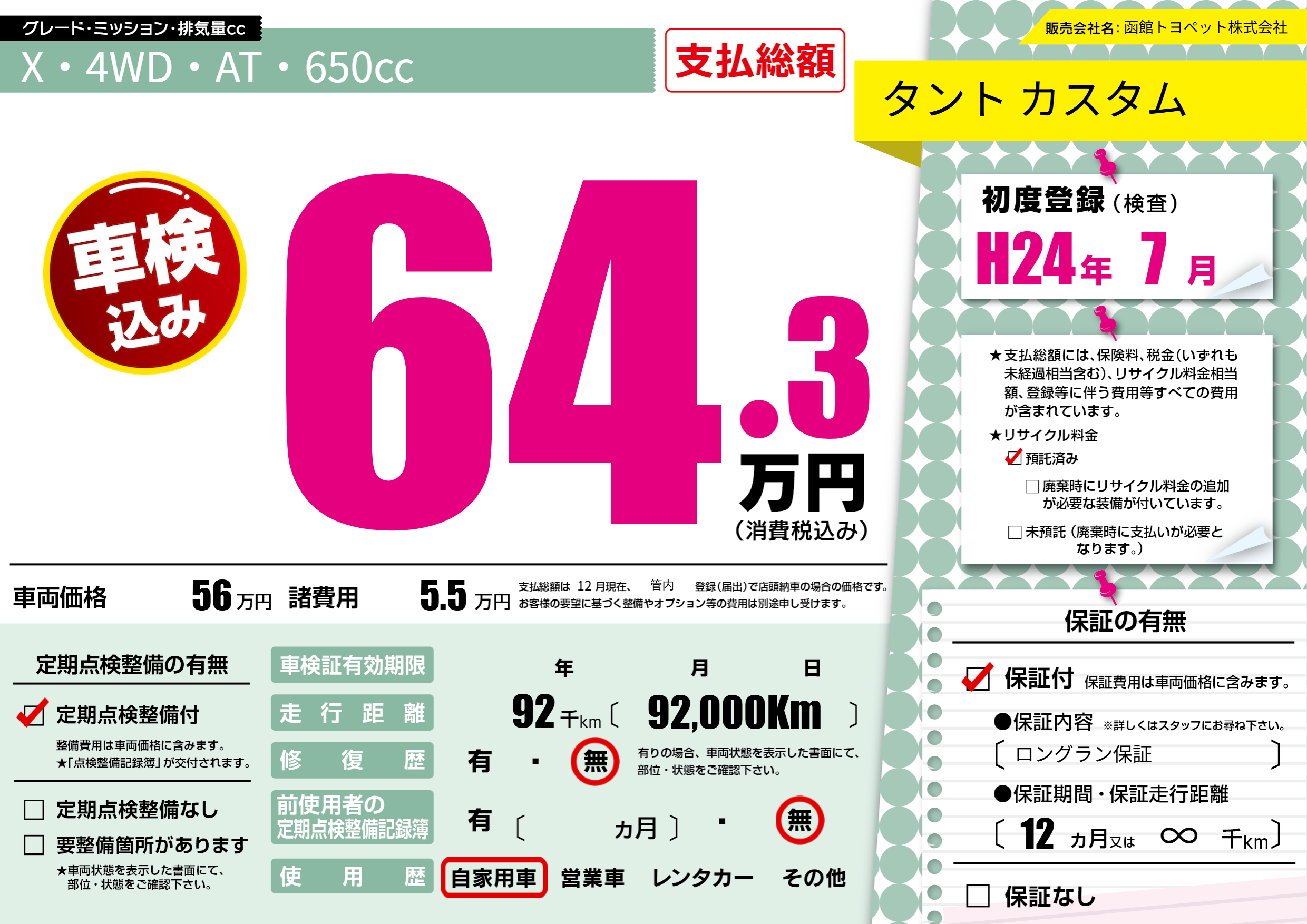 | 車名 | タント カスタム | グレード ミッション 排気量 |