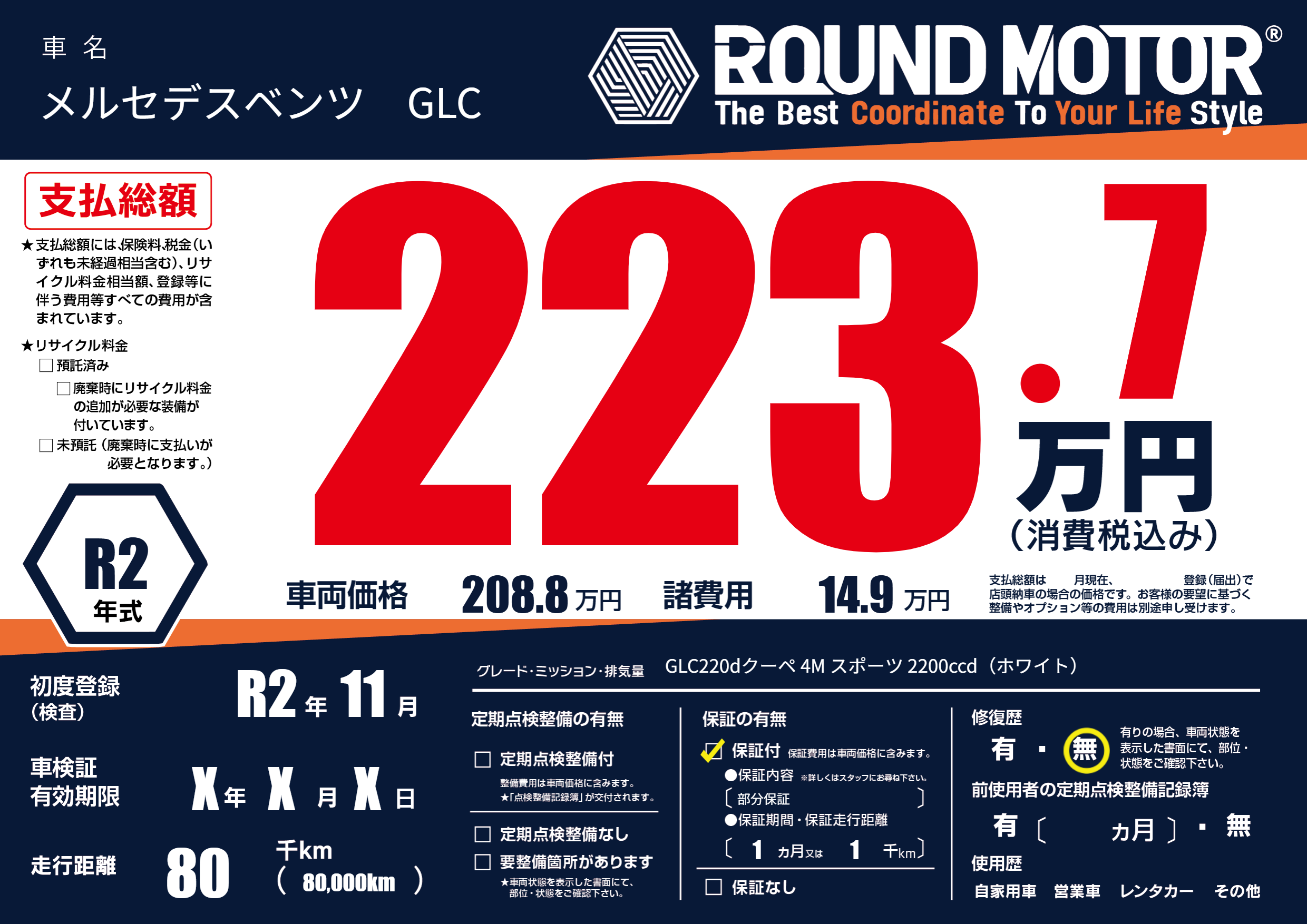 | 車名 | メルセデスベンツ GLC | グレード ミッション 排気量 |
