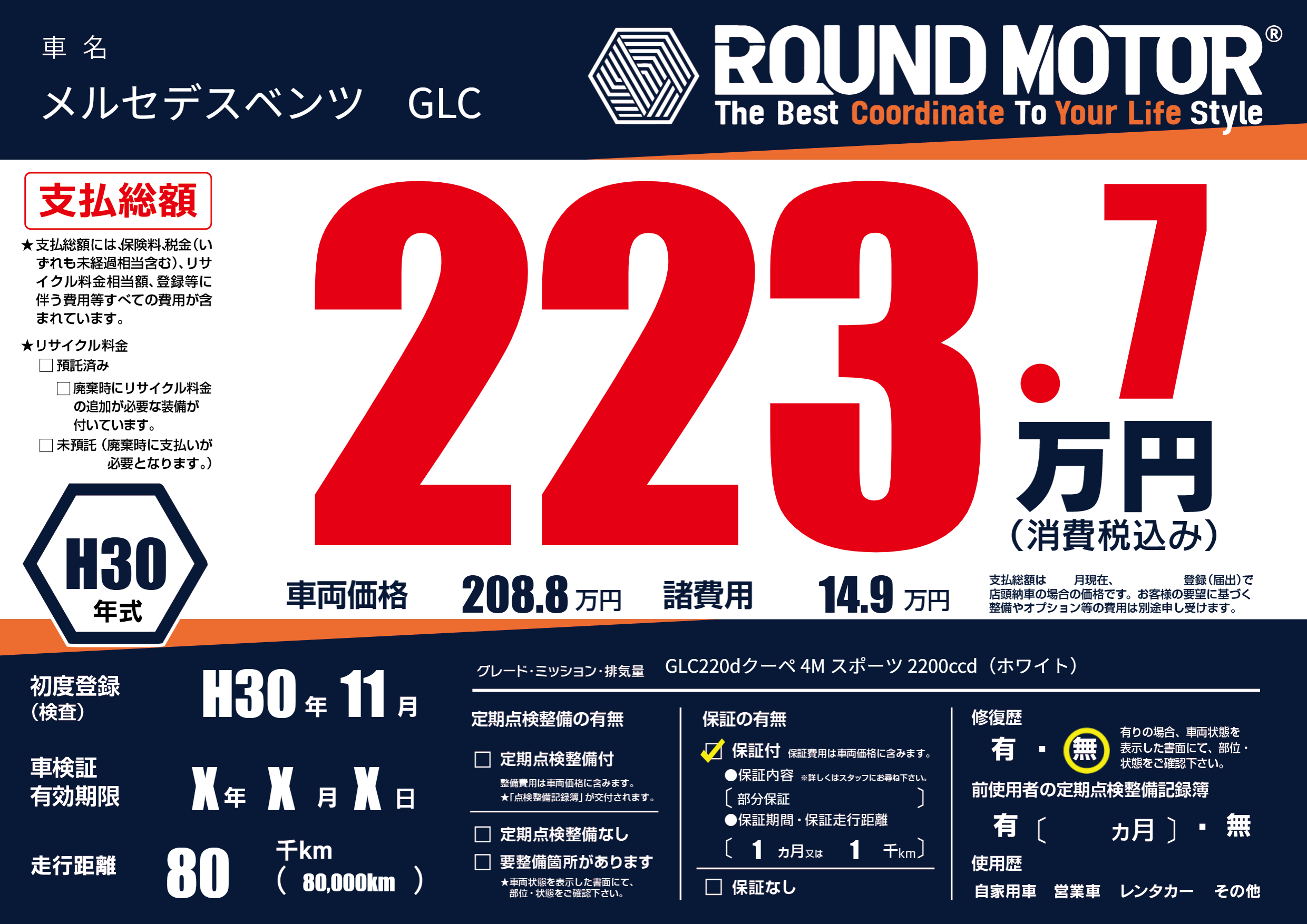 | 車名 | メルセデスベンツ GLC | グレード ミッション 排気量 |