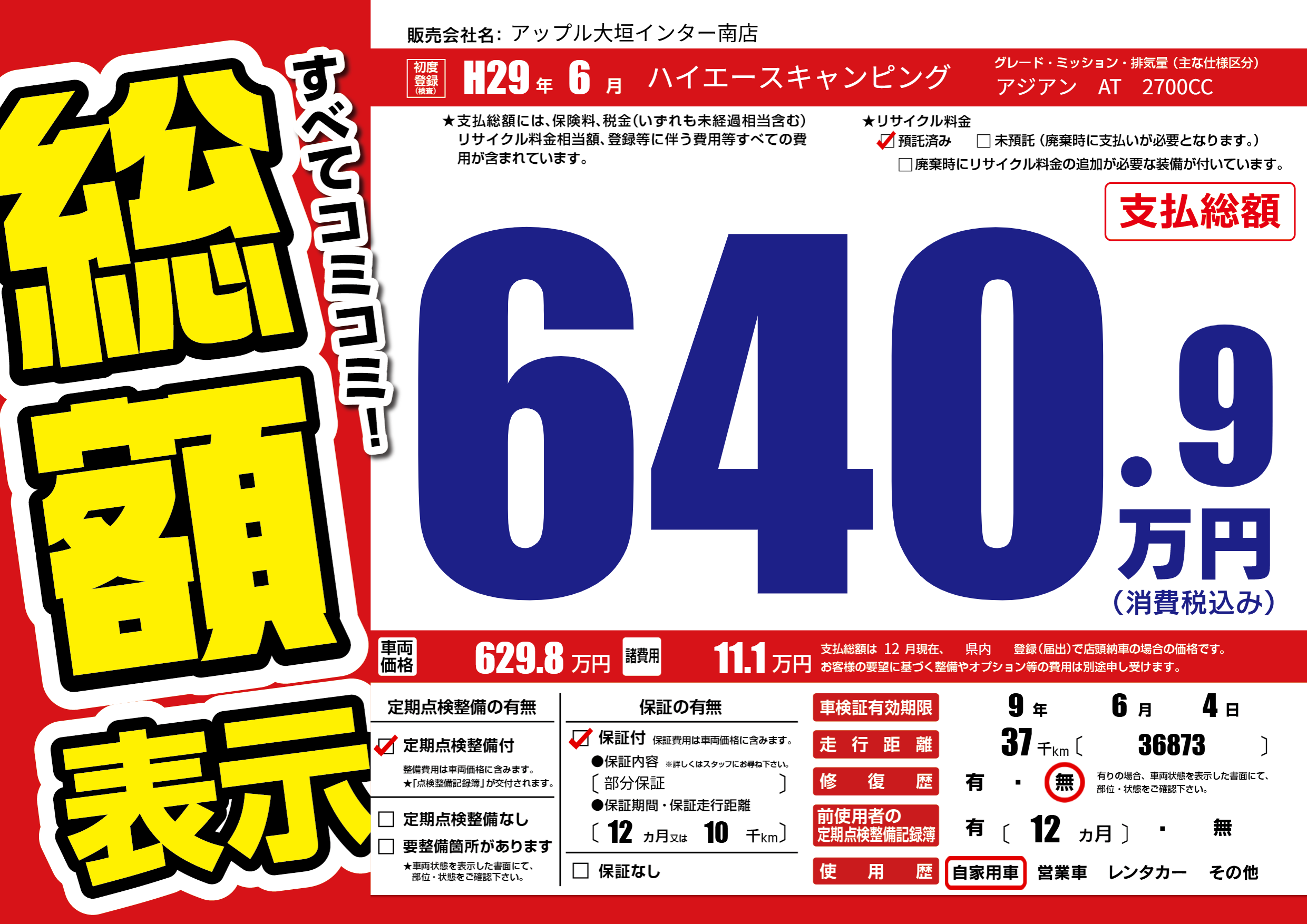 | 走行キロ | 3.7万km | 初年度登録 | H29年6月 |