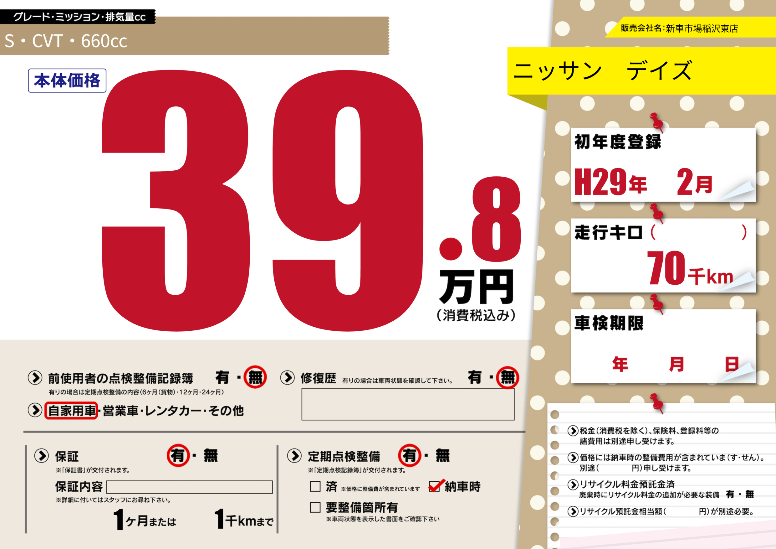 | 定期点検整備 | 定期点検整備あり 納車時あり | ||