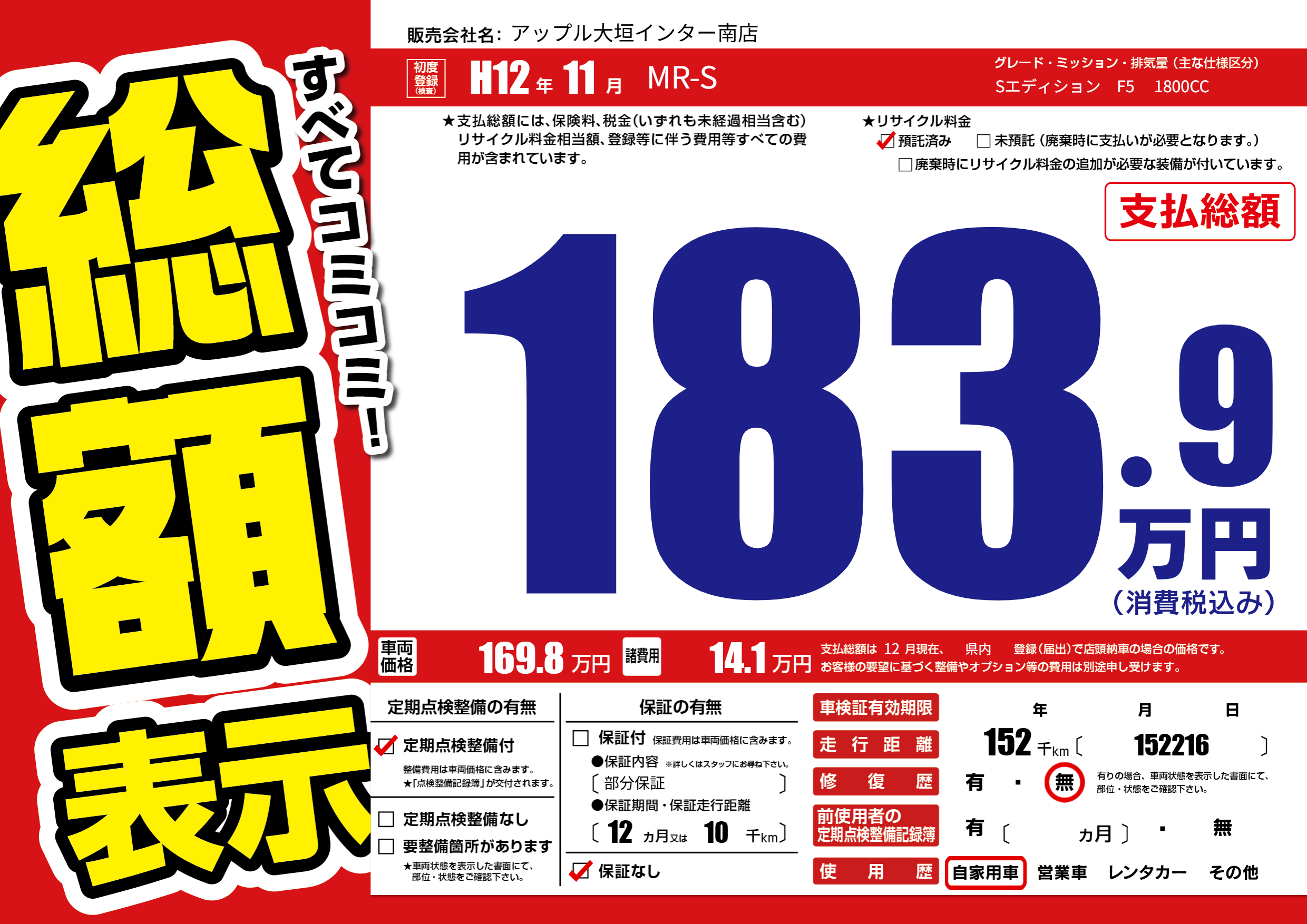 | 車名 | MR-S | グレード ミッション 排気量 |