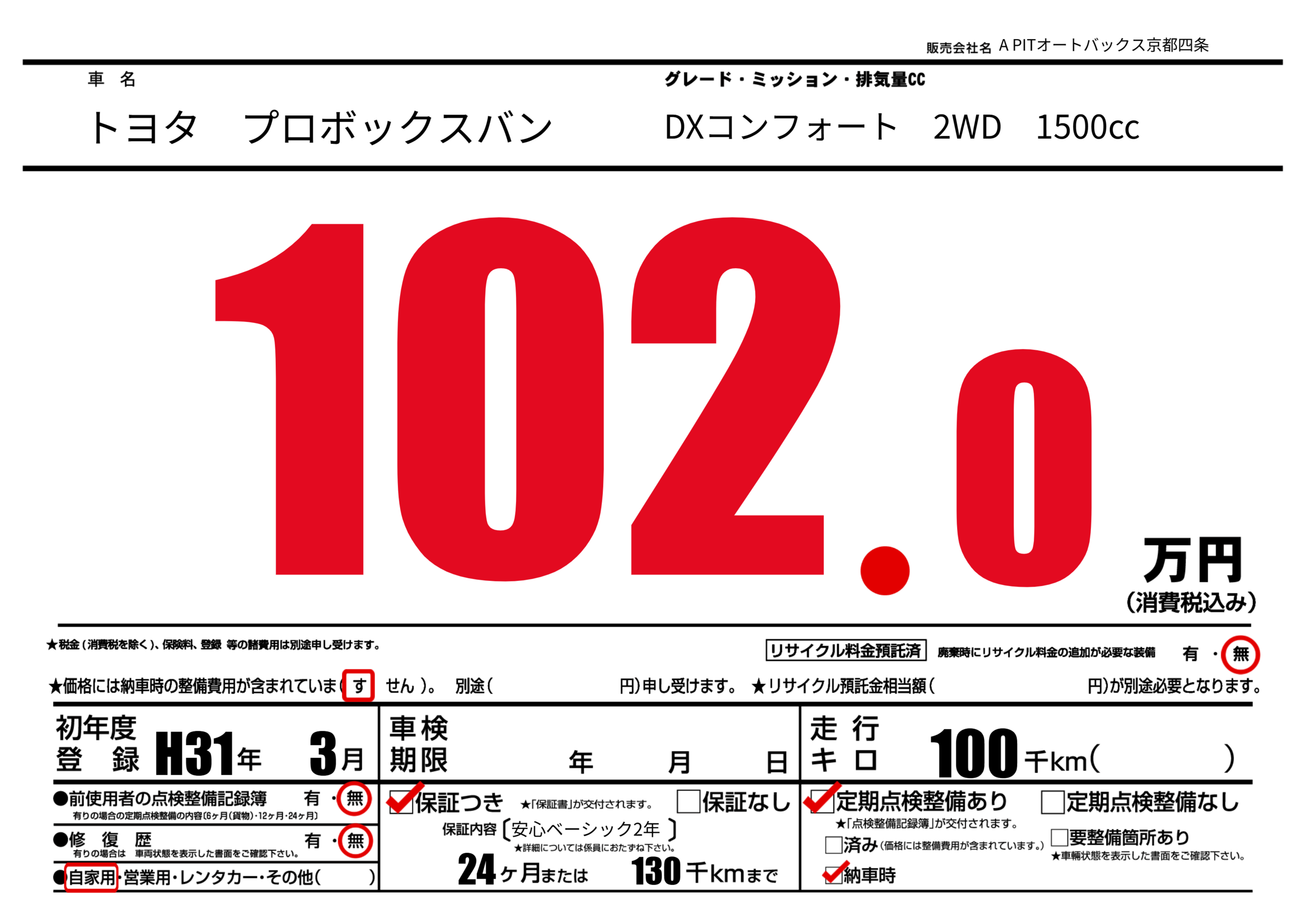 保証なし 保証内容(安心ベーシック2年) 24ヶ月または(130)千kmまで |