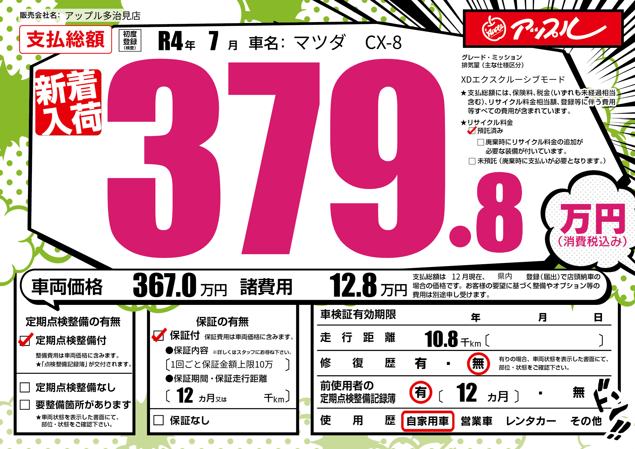 | 車名 | マツダ CX-8 | グレード ミッション 排気量 |