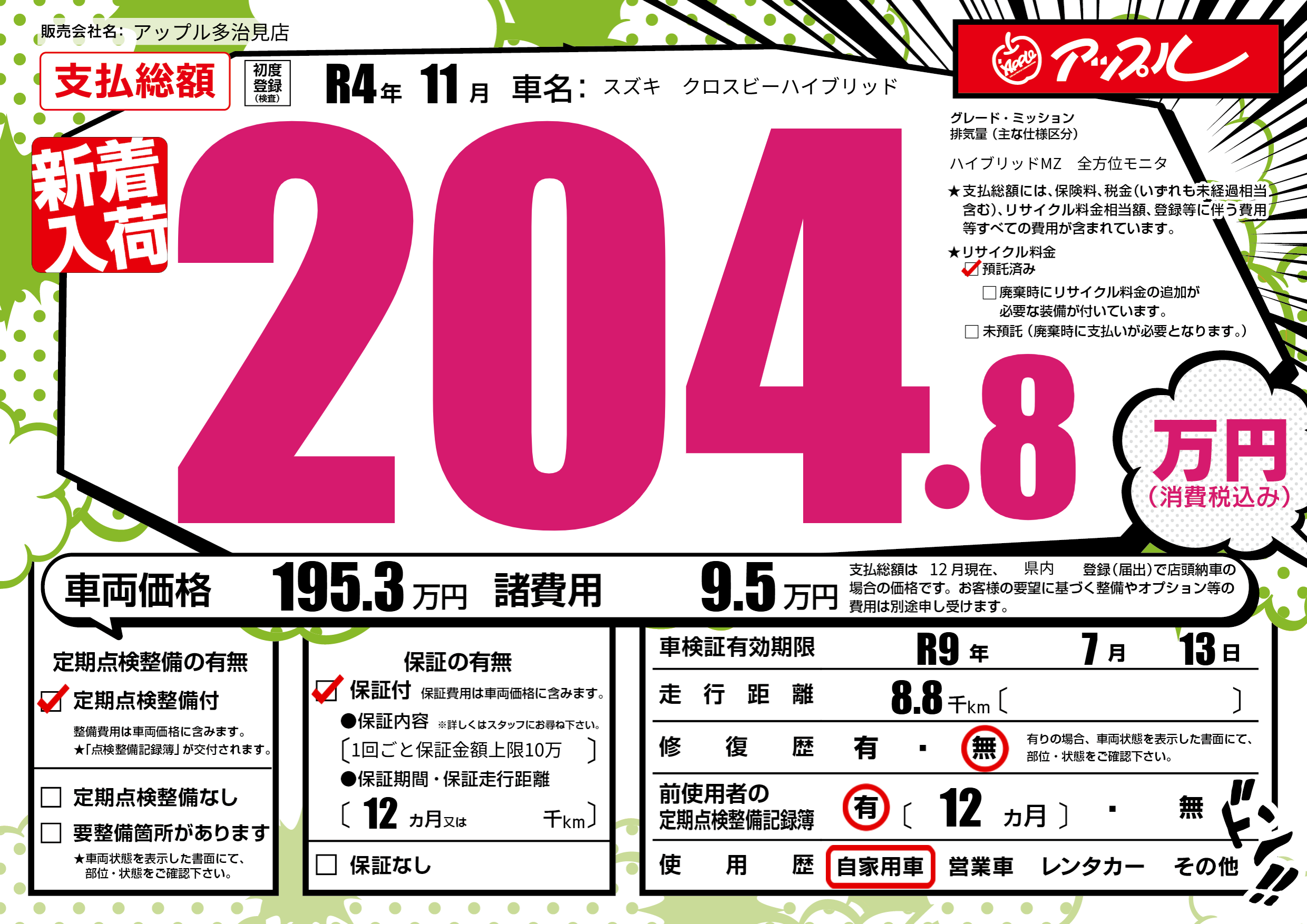 | 走行キロ | 0.8万km | 初年度登録 | R4年11月 |