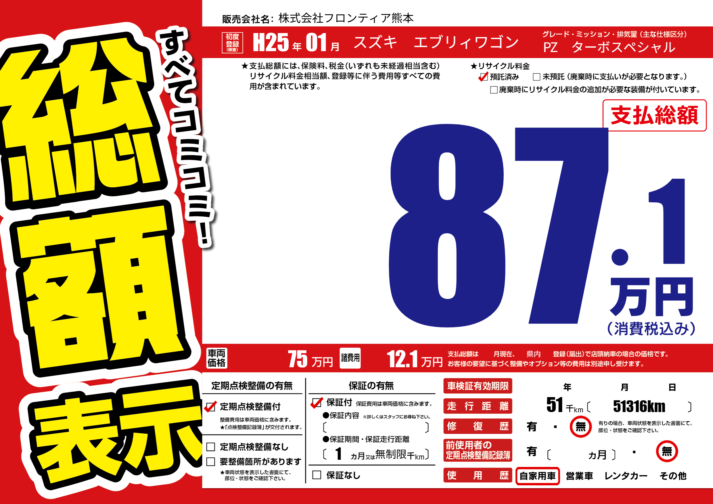 | 車名 | スズキ エブリィワゴン | グレード ミッション 排気量 |