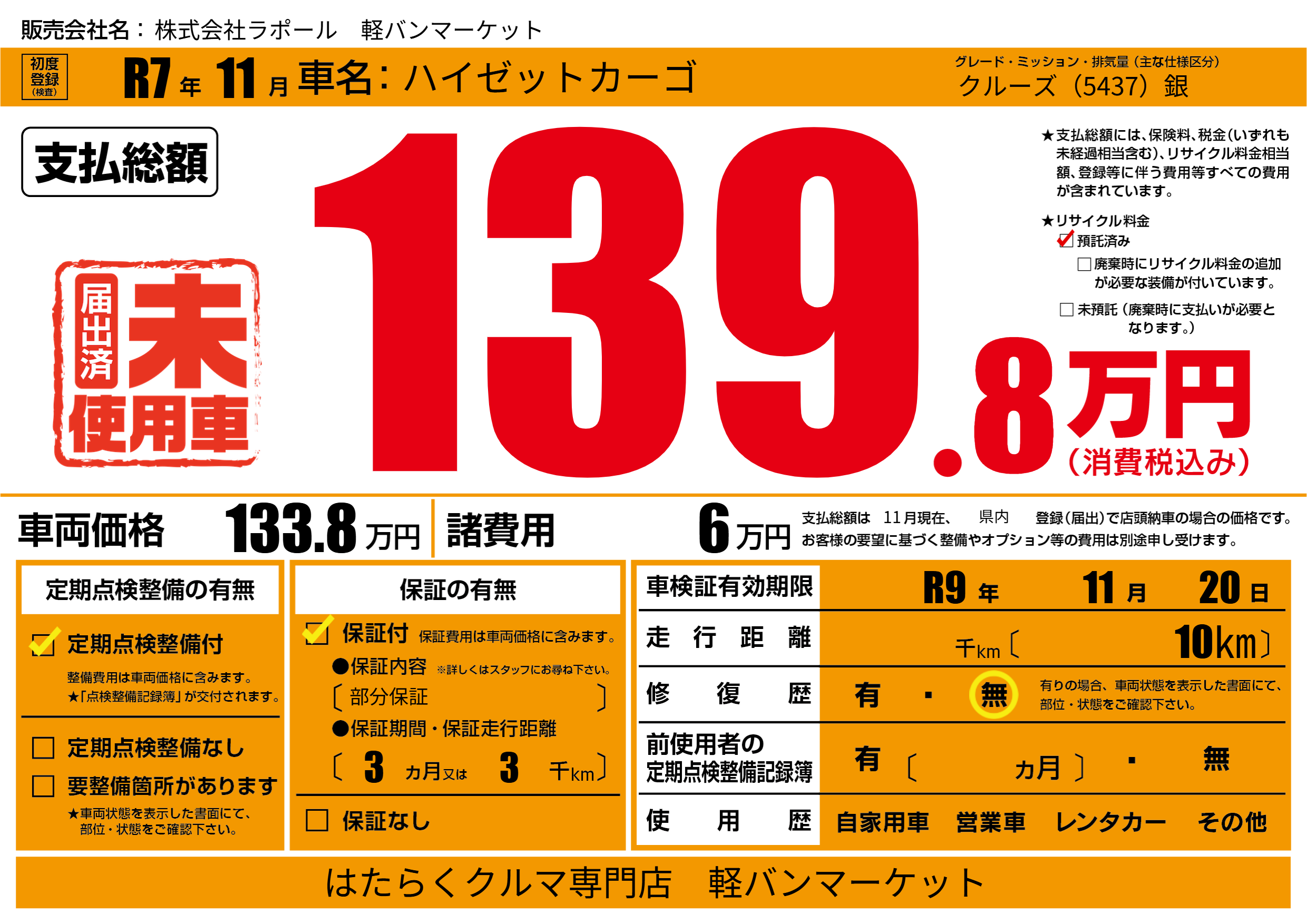 | 走行キロ | - | 初年度登録 | R7年11月 |
