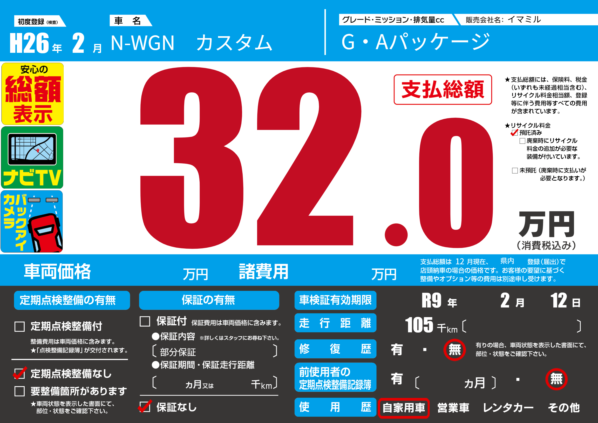 | 車名 | N-WGN カスタム | グレード ミッション 排気量 |