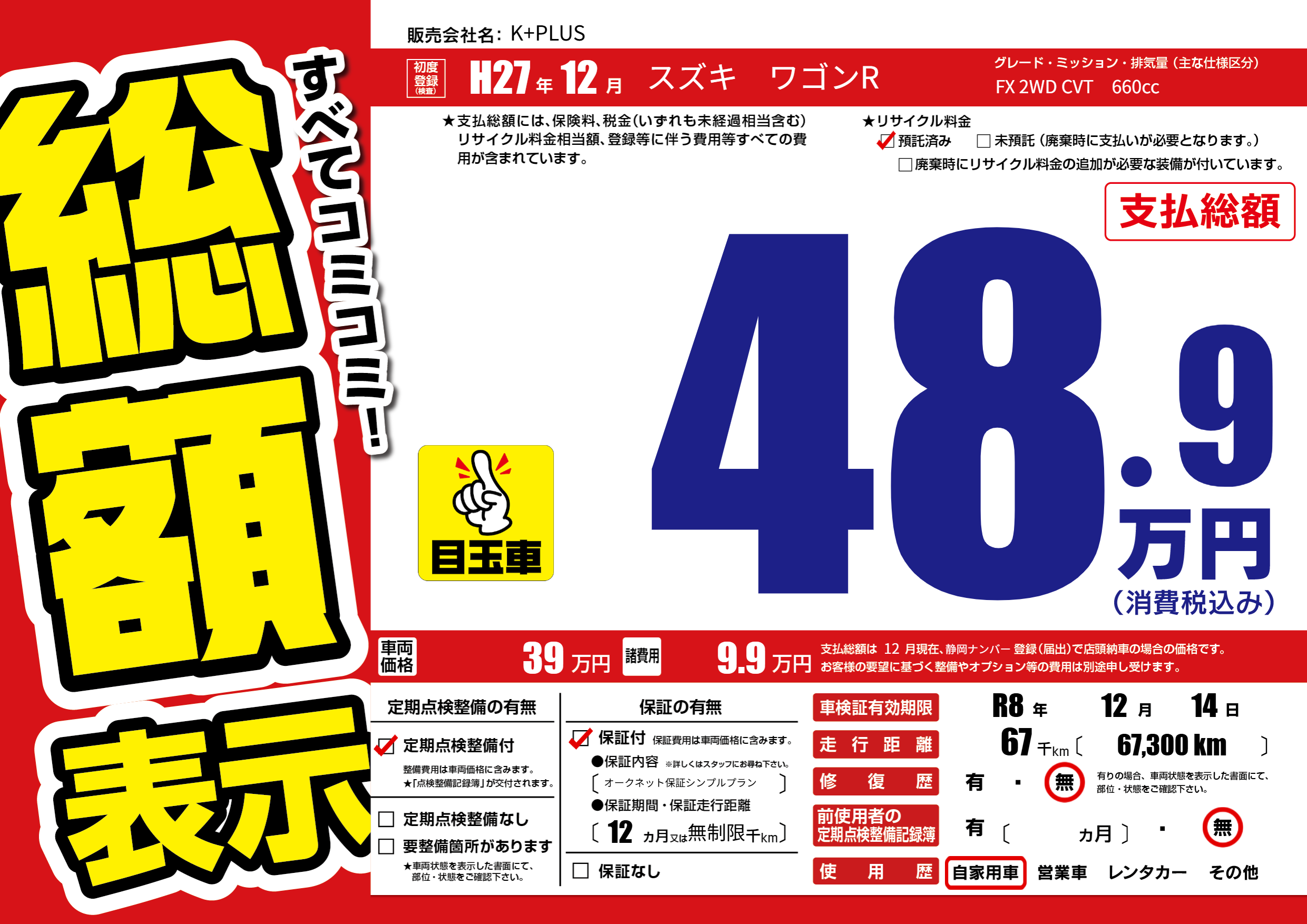 | 車名 | スズキ ワゴンR | グレード ミッション 排気量 |