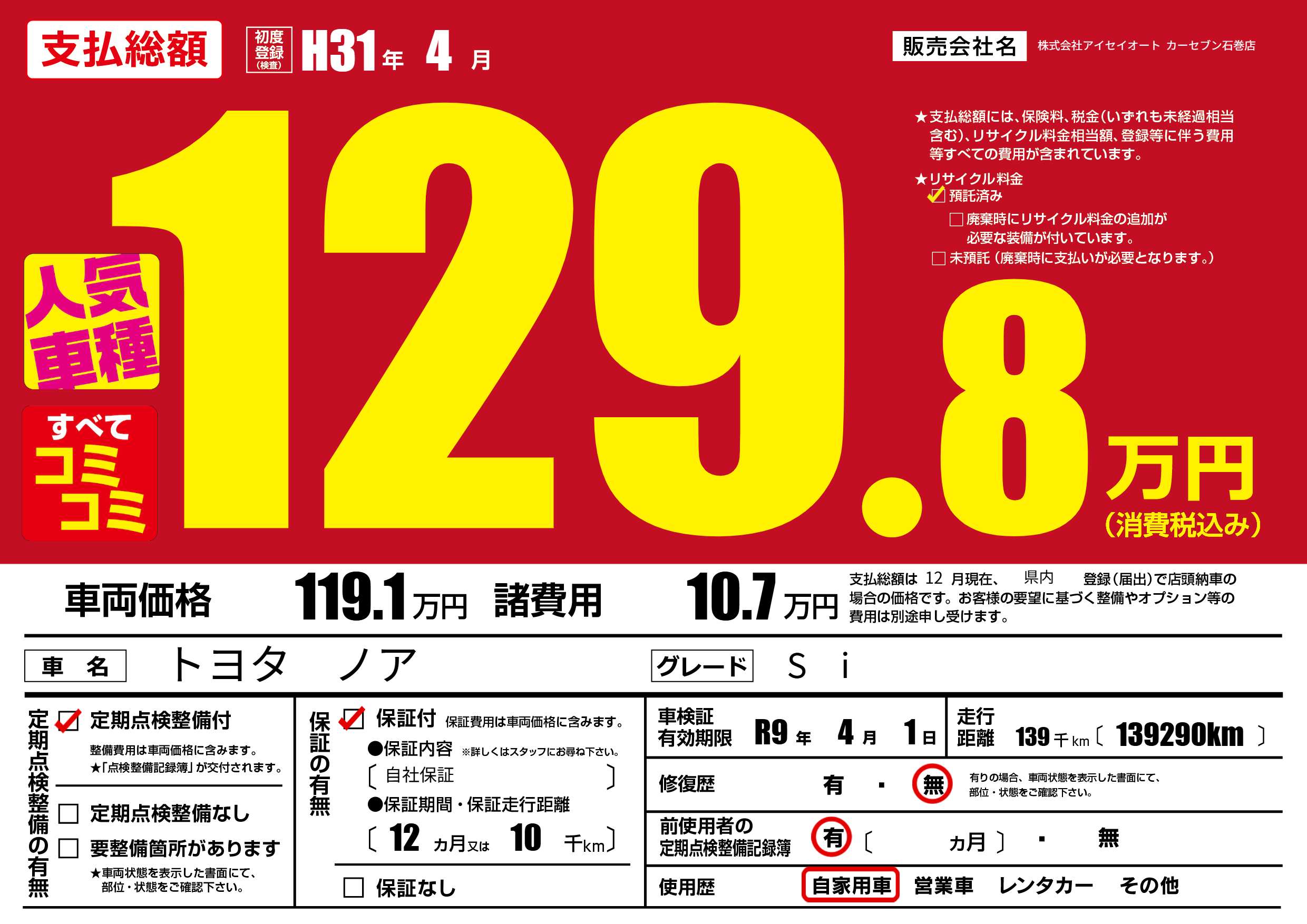 | 走行キロ | 13.9万km | 初年度登録 | H31年4月 |