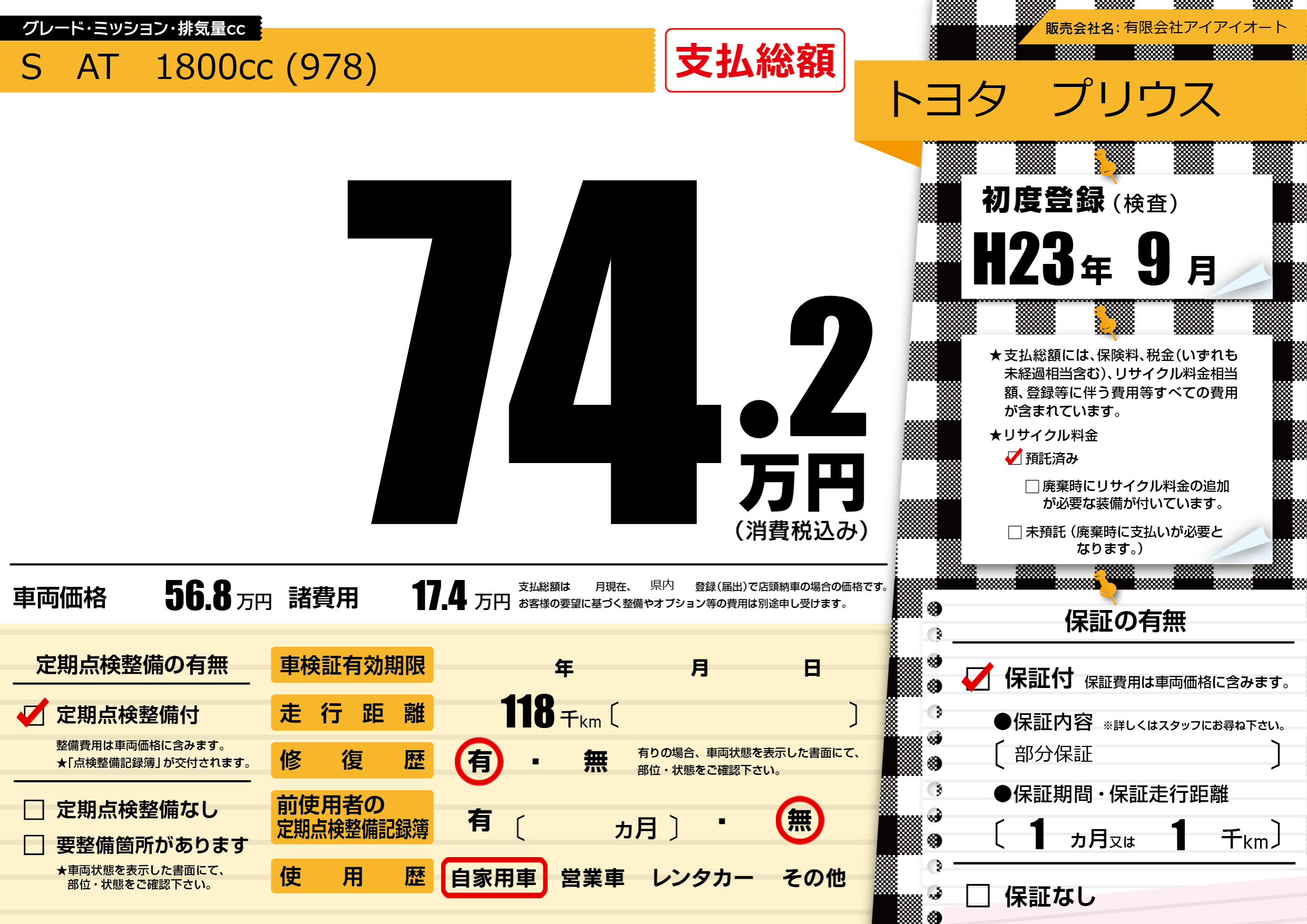 | 車名 | トヨタ プリウス | グレード ミッション 排気量 |
