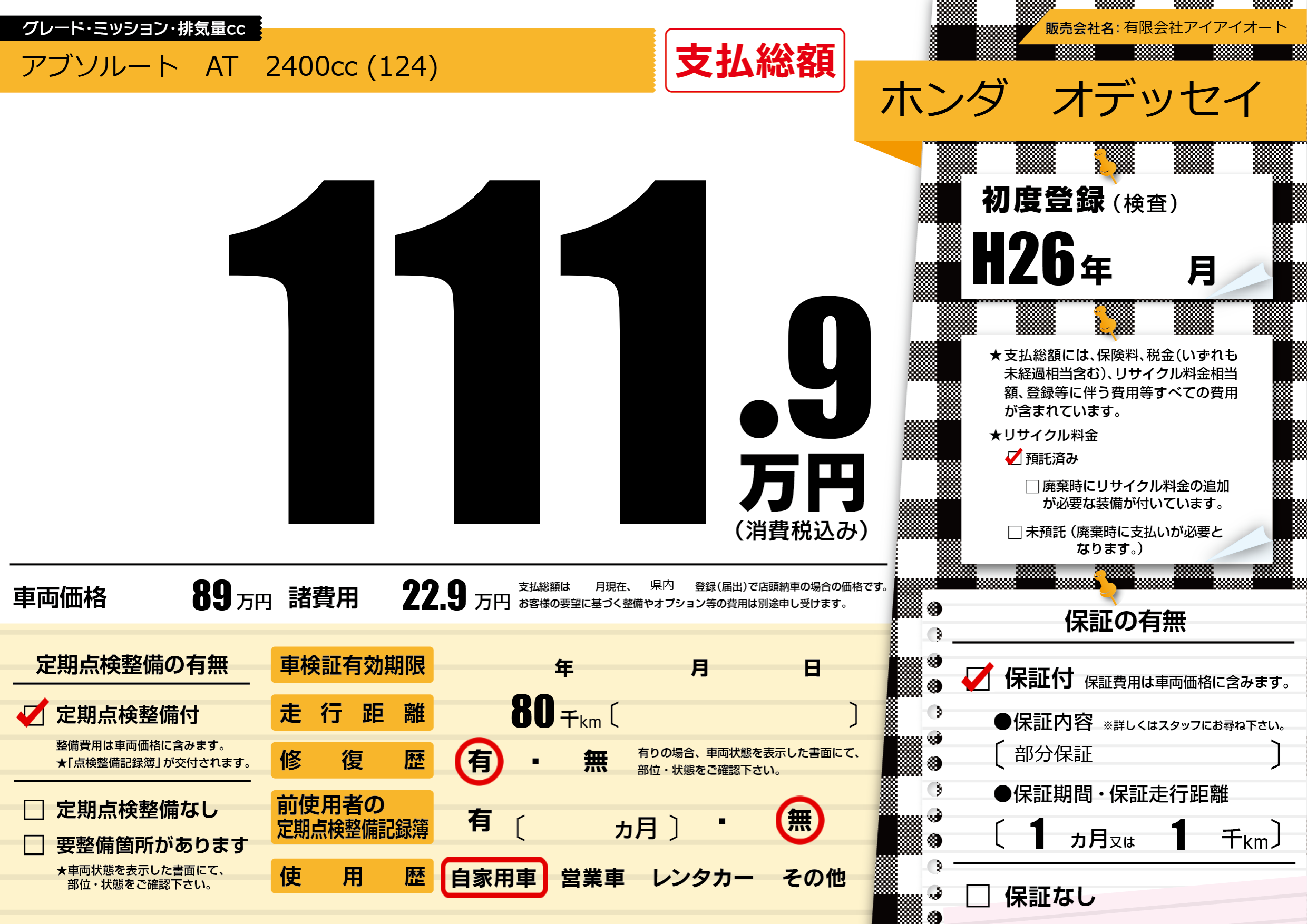 | 車名 | ホンダ オデッセイ | グレード ミッション 排気量 |