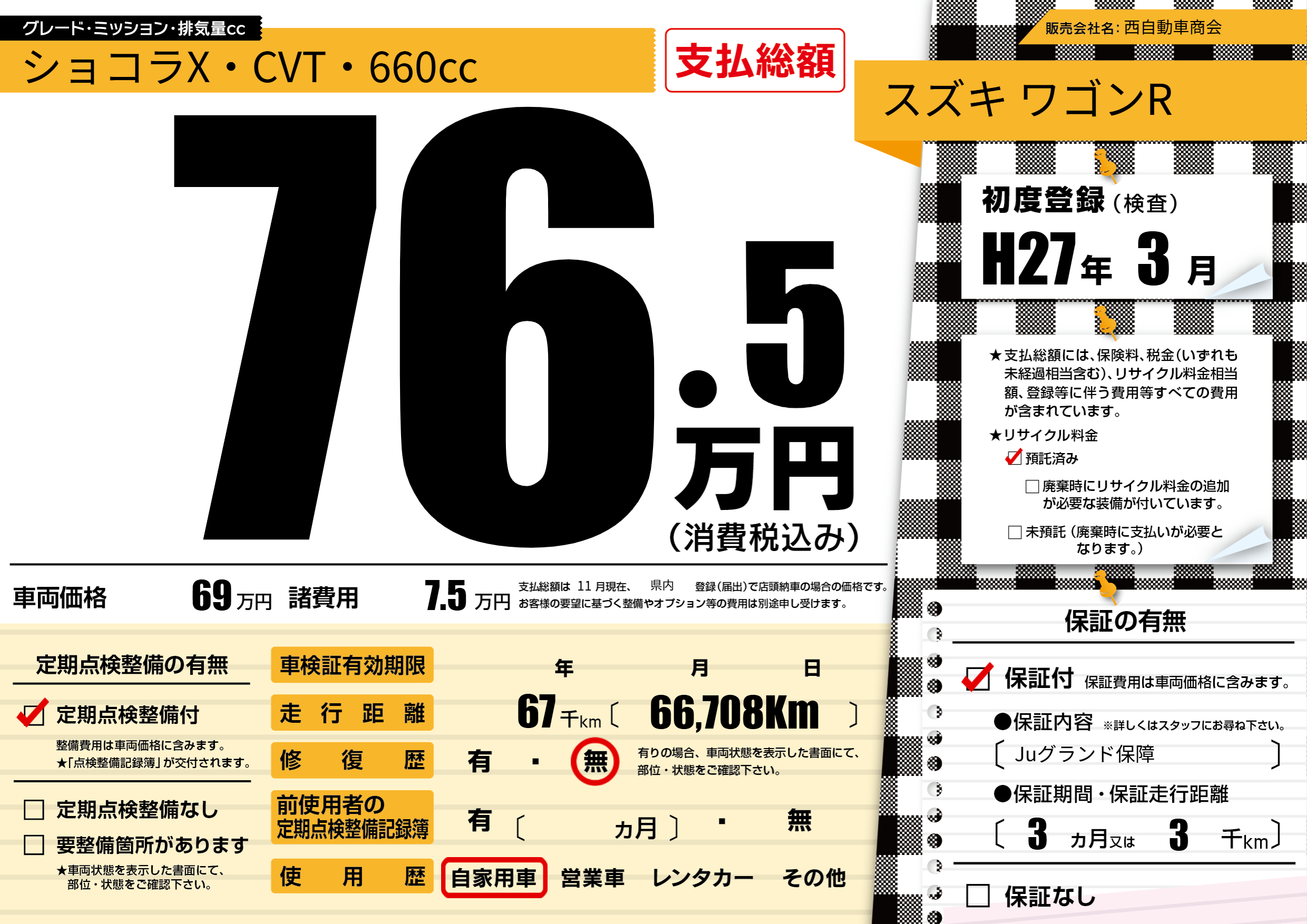 | 走行キロ | 6.7万km | 初年度登録 | H27年3月 |