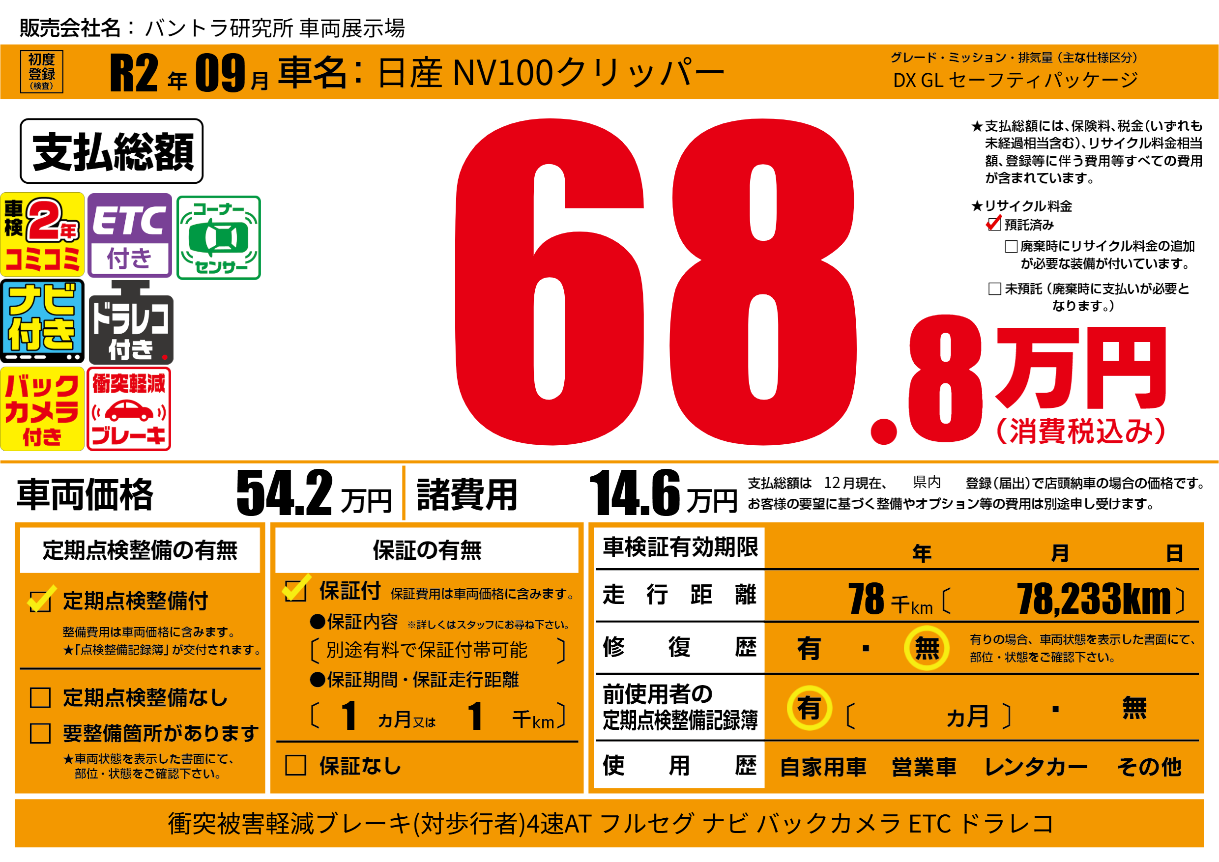 | 走行キロ | 7.8万km | 初年度登録 | R2年09月 |