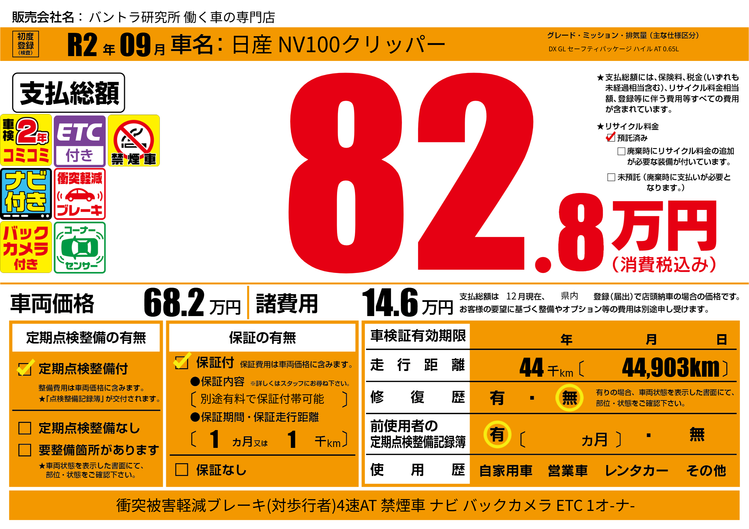 | 車名 | 日産 NV100クリッパー | グレード ミッション 排気量 |