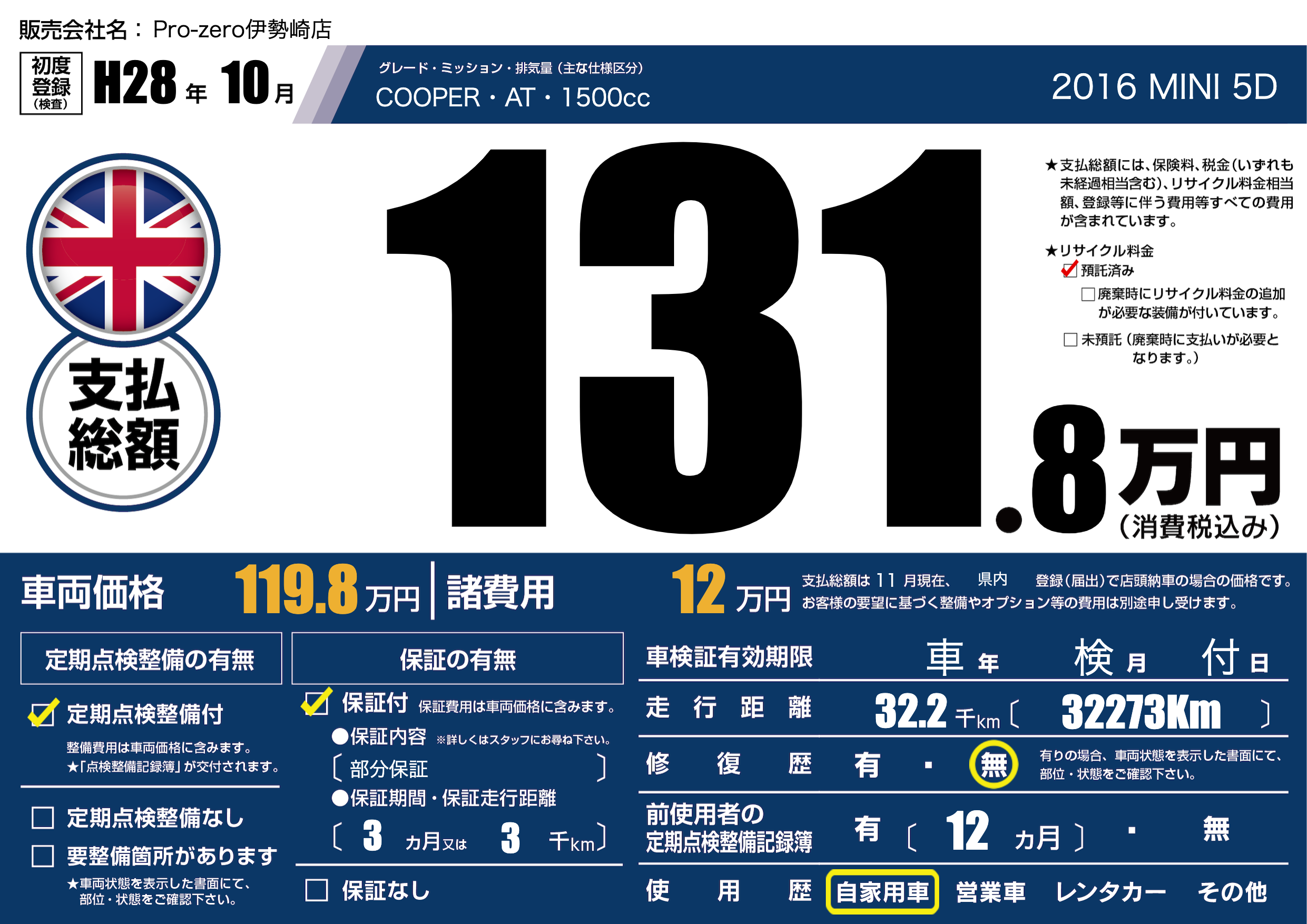 | 車名 | 2016 MINI 5D | グレード ミッション 排気量 |