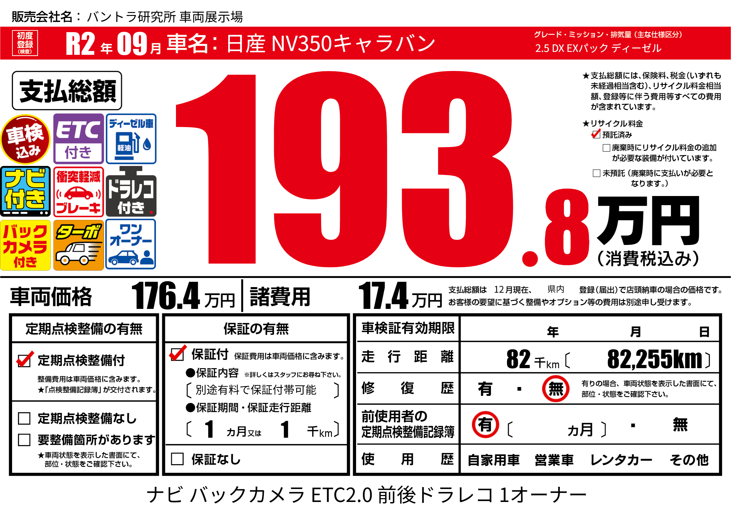| 車名 | 日産 NV350キャラバン | グレード ミッション 排気量 |