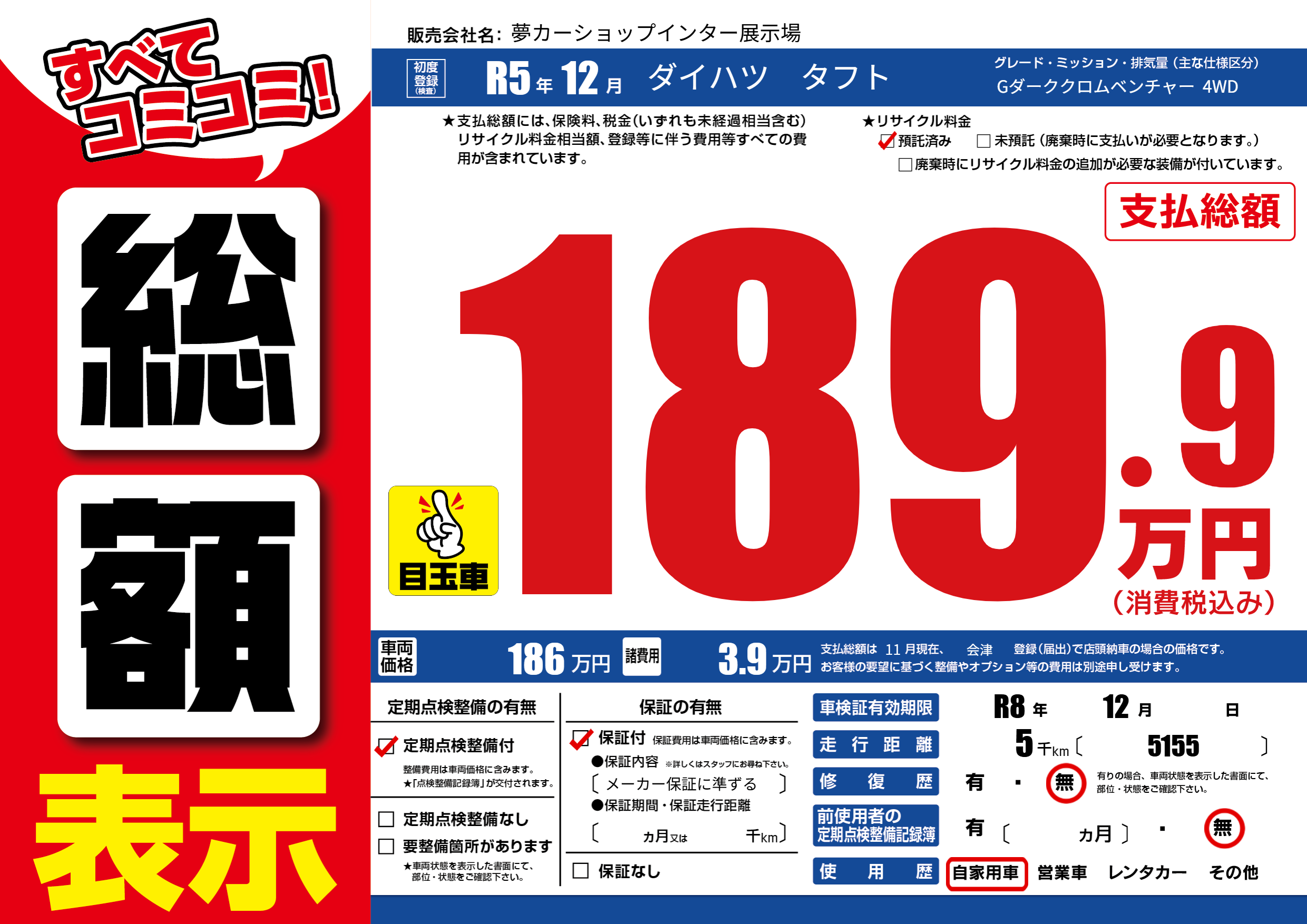 | 走行キロ | 0.5万km | 初年度登録 | R5年12月 |