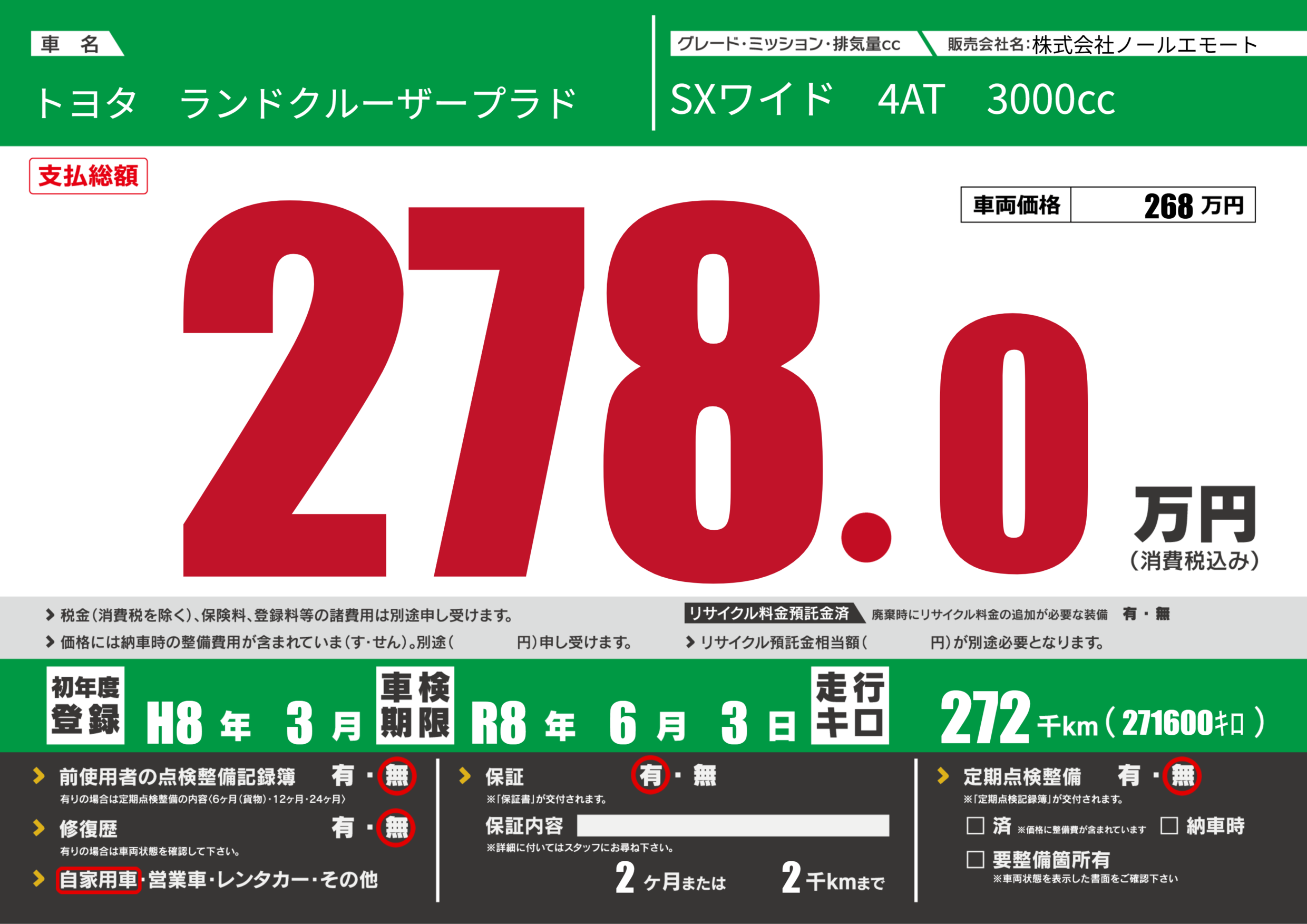| 車名 | トヨタ ランドクルーザープラド | グレード ミッション 排気量 |