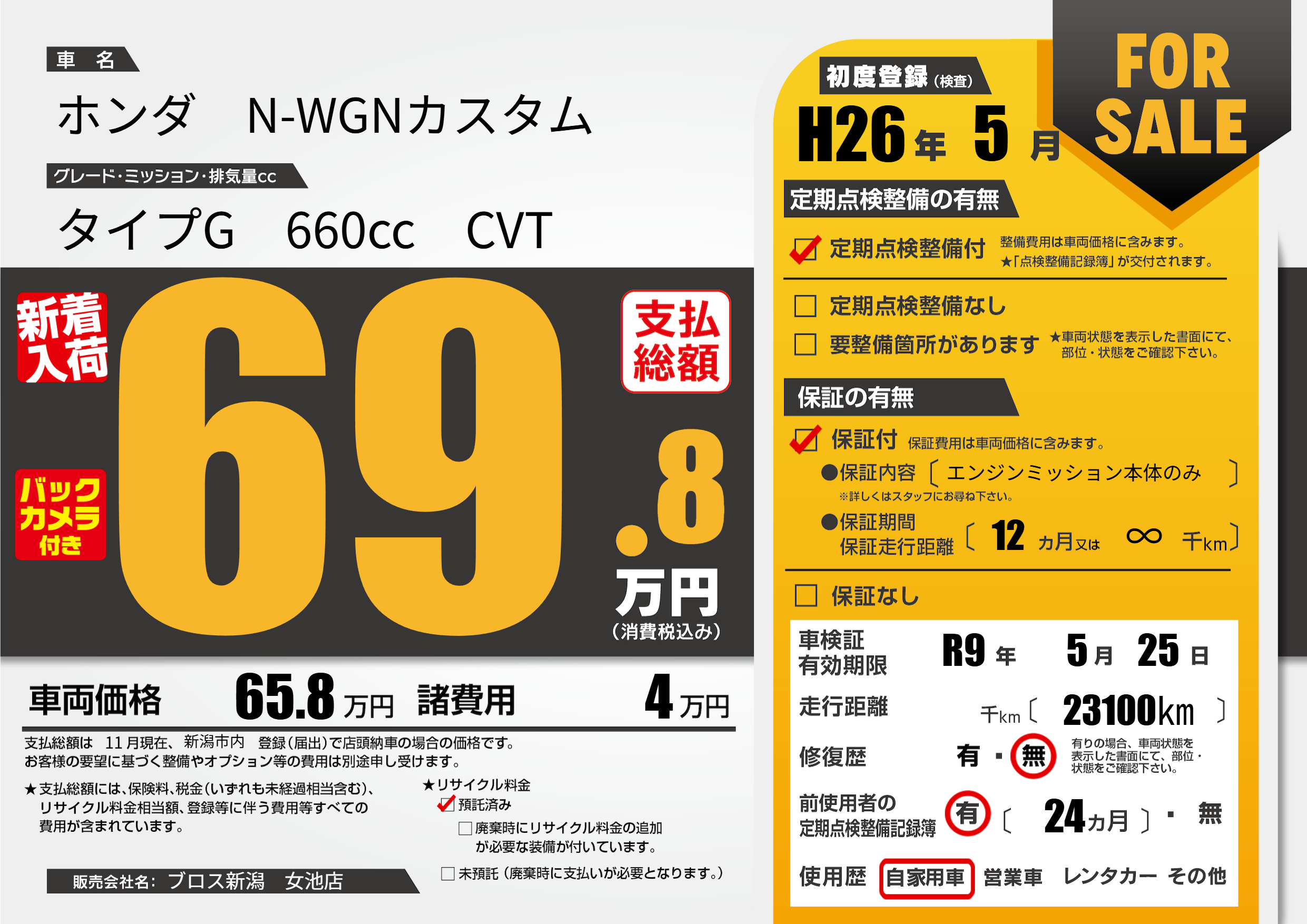 | 車名 | ホンダ N-WGNカスタム | グレード ミッション 排気量 |
