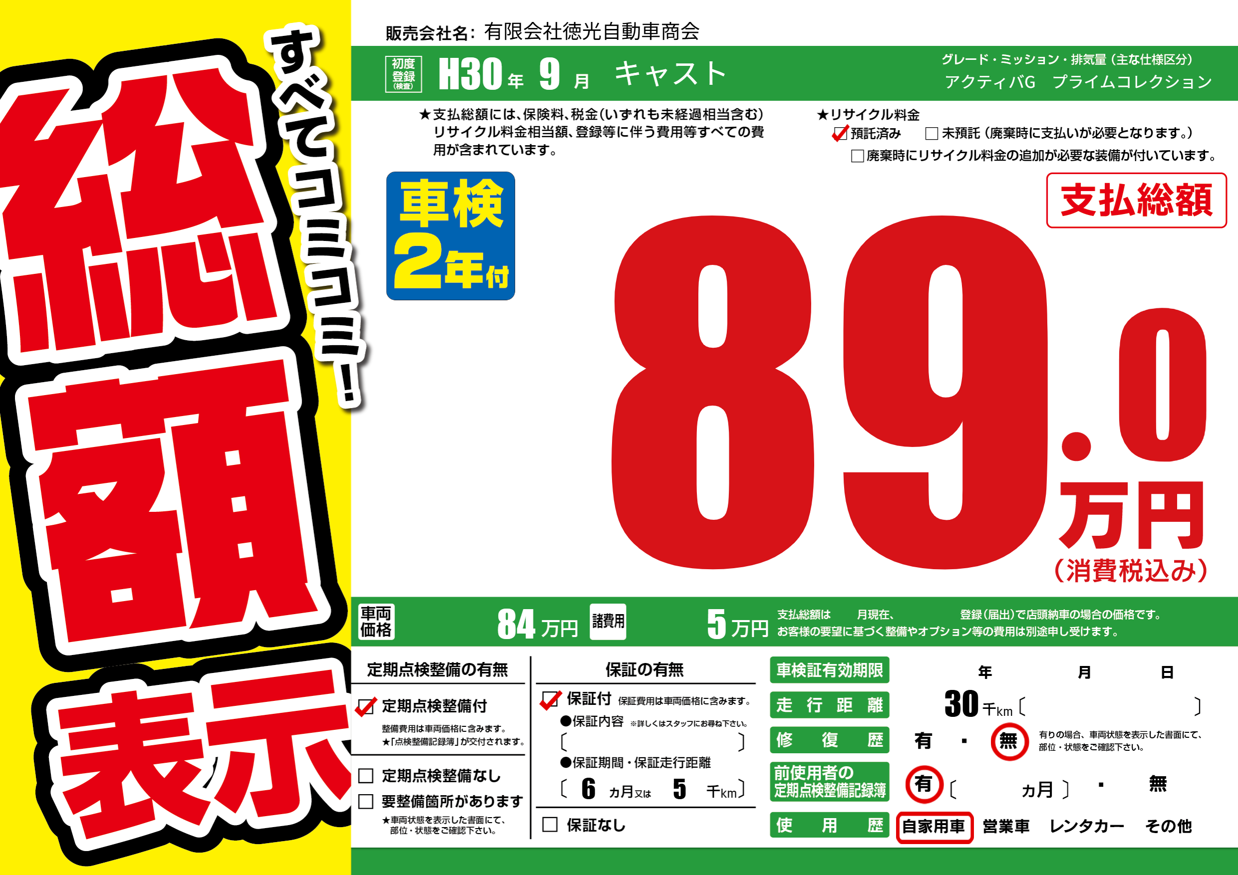 | 走行キロ | 3万km | 初年度登録 | H30年9月 |
