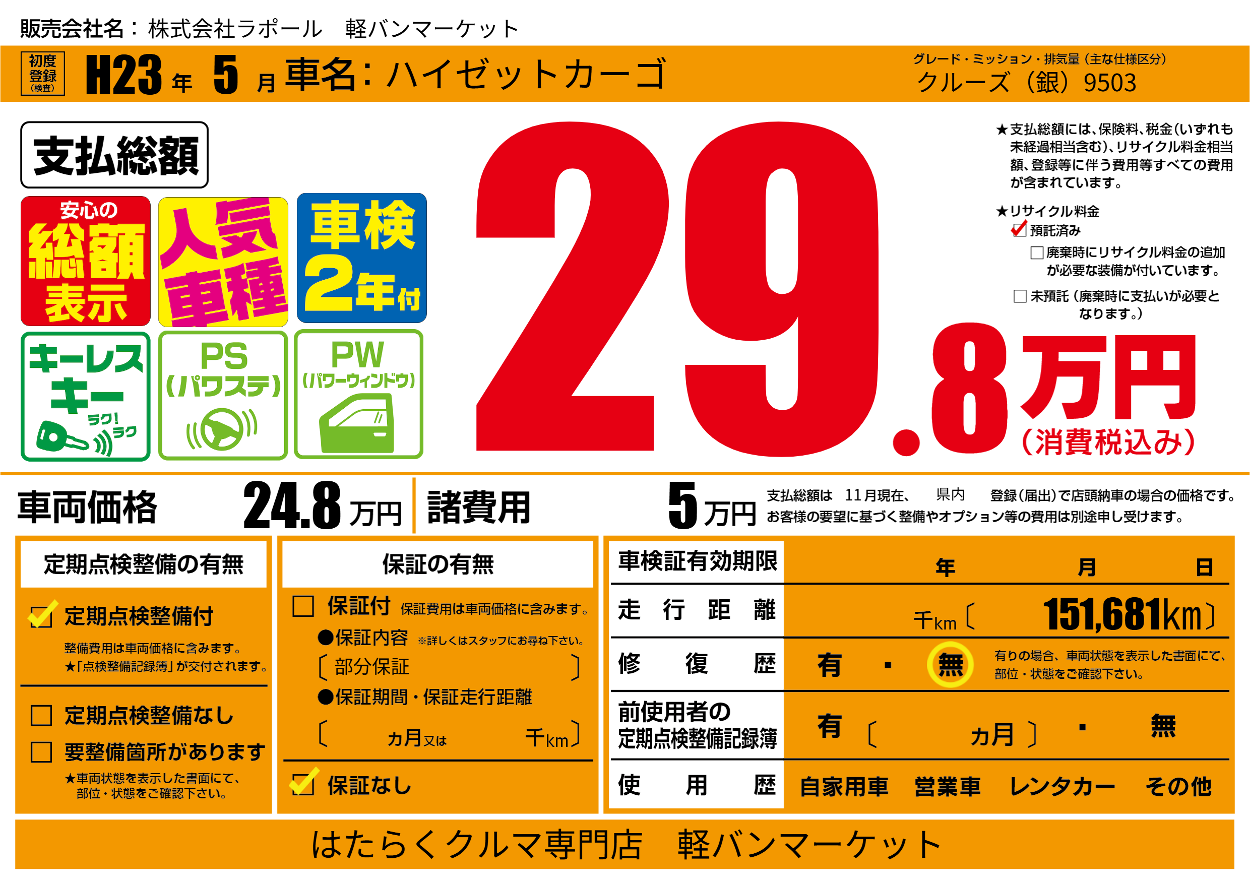 | 走行キロ | - | 初年度登録 | H23年5月 |