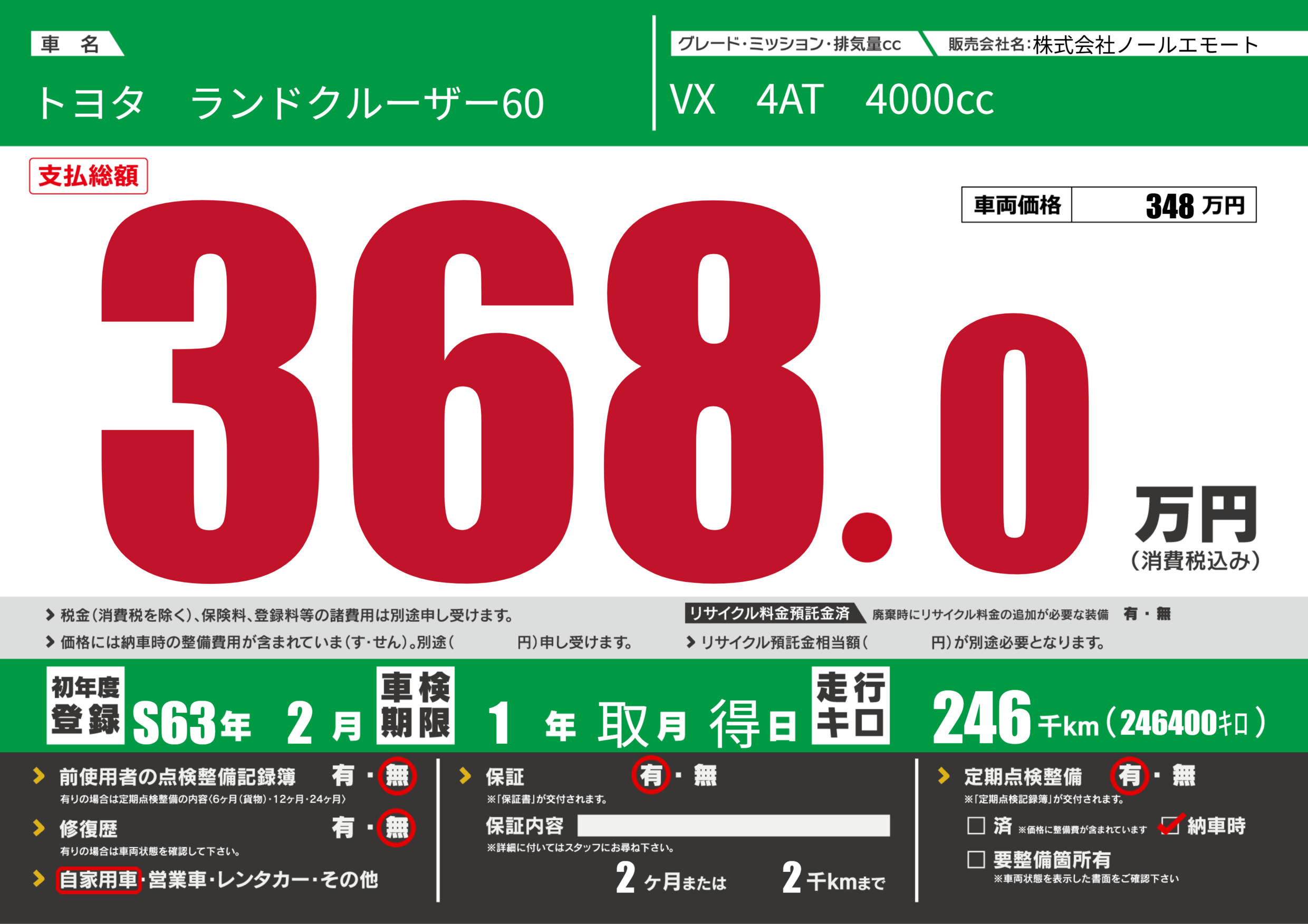 | 走行キロ | 24.6万km | 初年度登録 | S63年2月 |