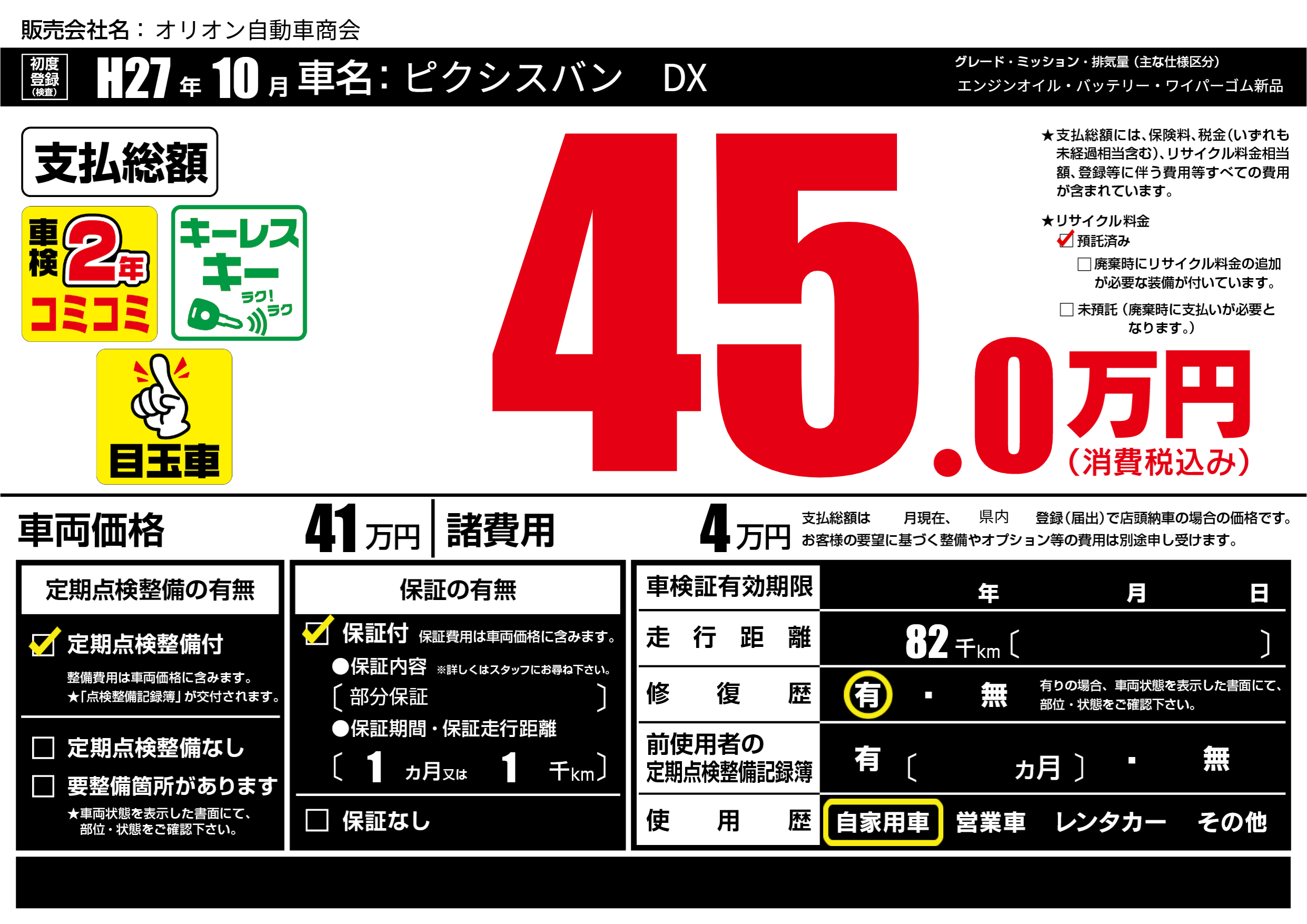 | 車名 | ピクシスバン DX | グレード ミッション 排気量 |