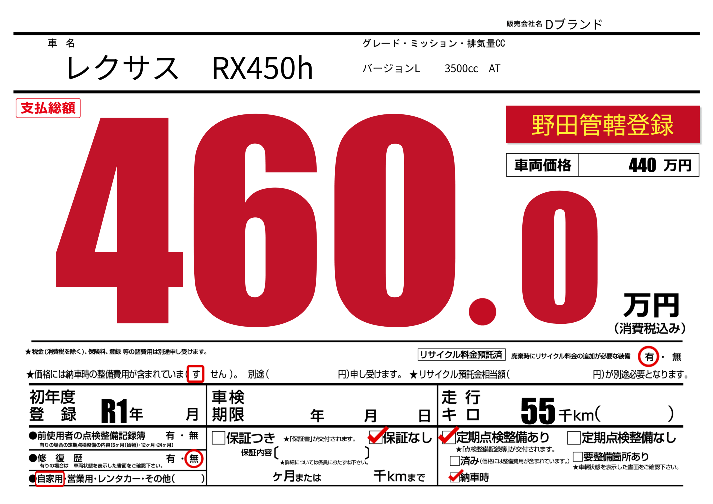 | 車名 | レクサス RX450h | グレード ミッション 排気量 |