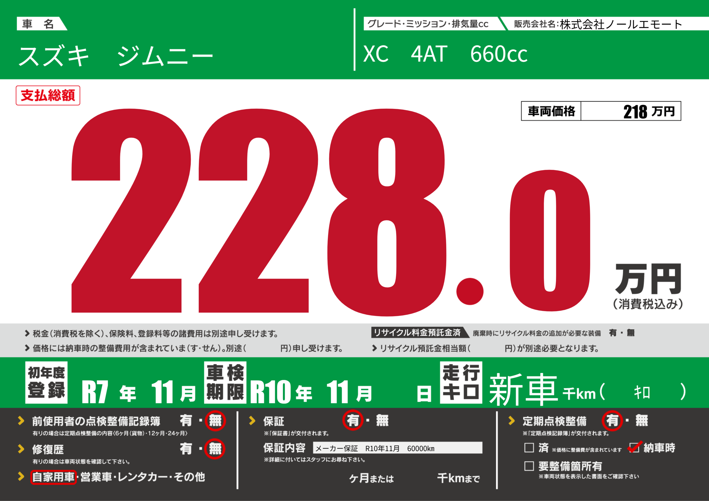 | 走行キロ | - | 初年度登録 | R7年11月 |