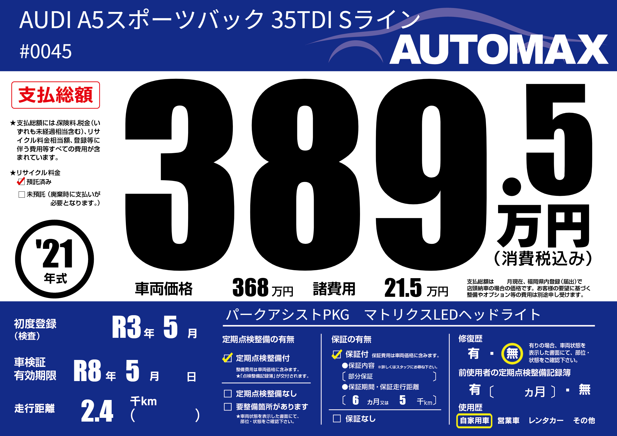 | 車名 | AUDI A5スポーツバック 35TDI Sライン | グレード ミッション 排気量 |