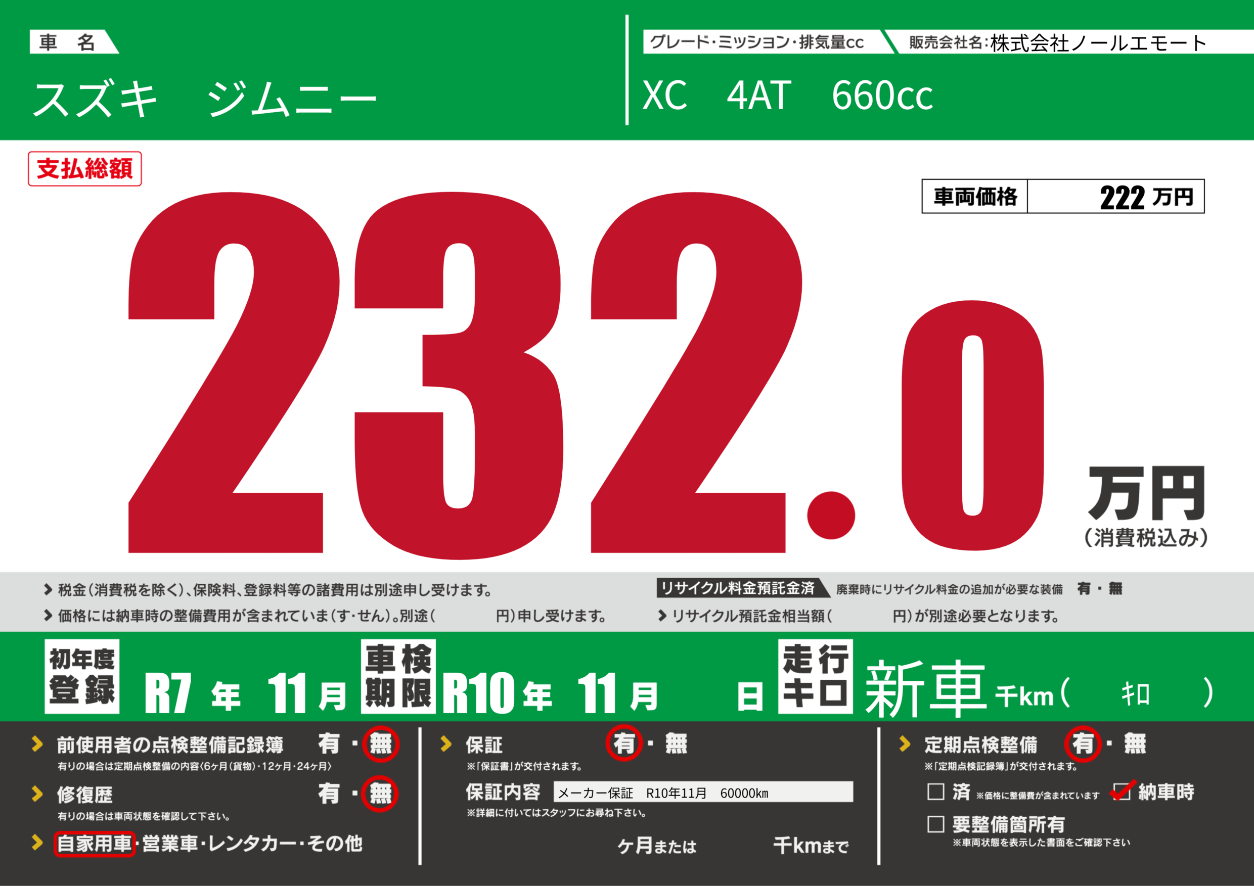 | 走行キロ | - | 初年度登録 | R7年11月 |