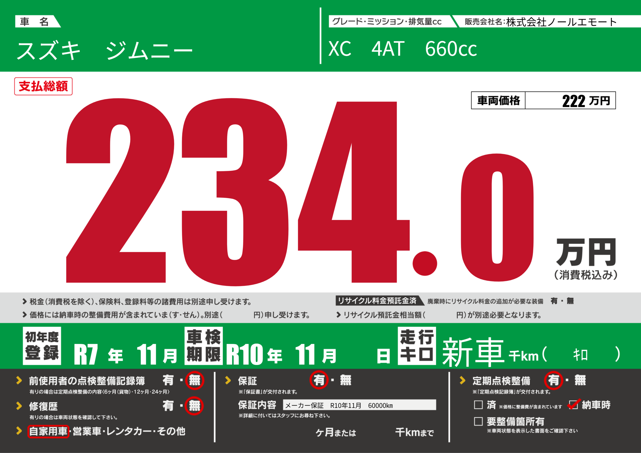 | 走行キロ | - | 初年度登録 | R7年11月 |