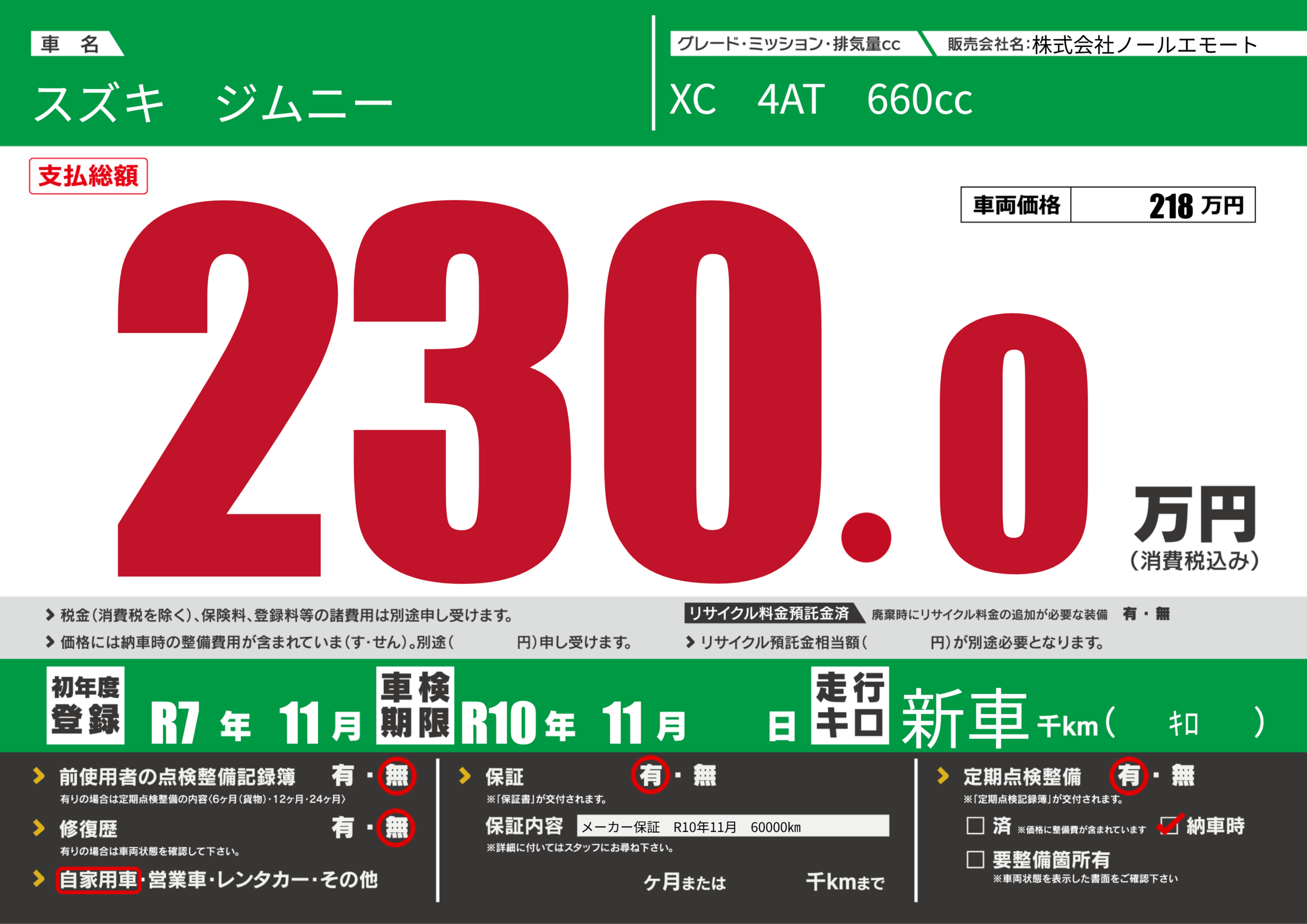 | 車検制限 | R10年 11月 - 日 | ||