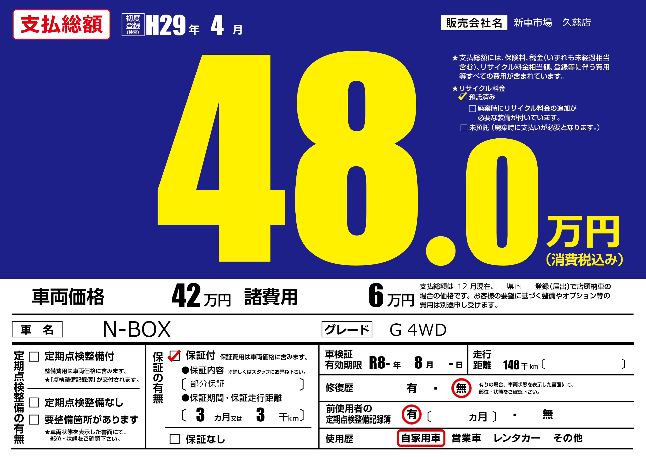 | 走行キロ | 14.8万km | 初年度登録 | H29年4月 |