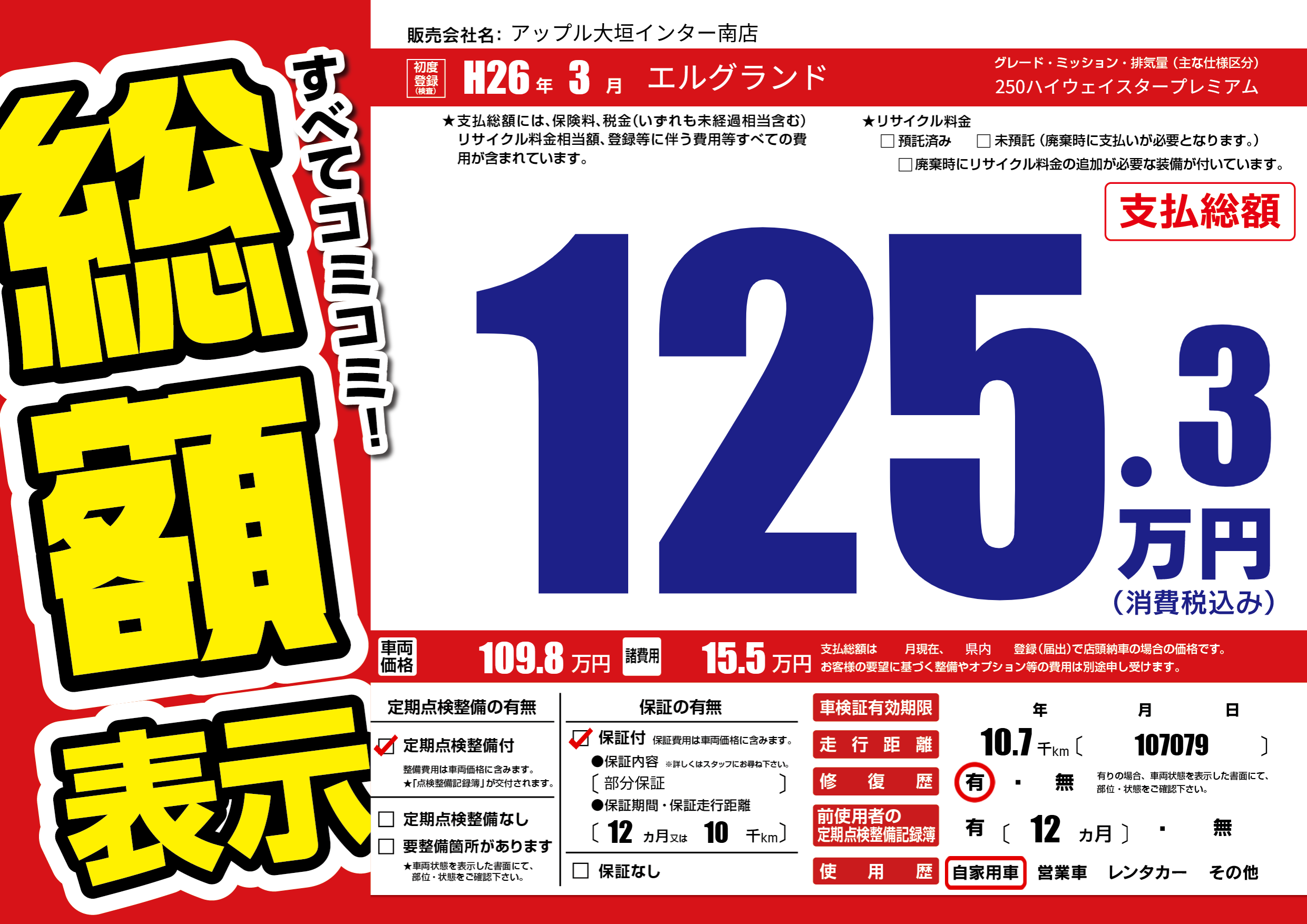 | 車名 | エルグランド | グレード ミッション 排気量 |