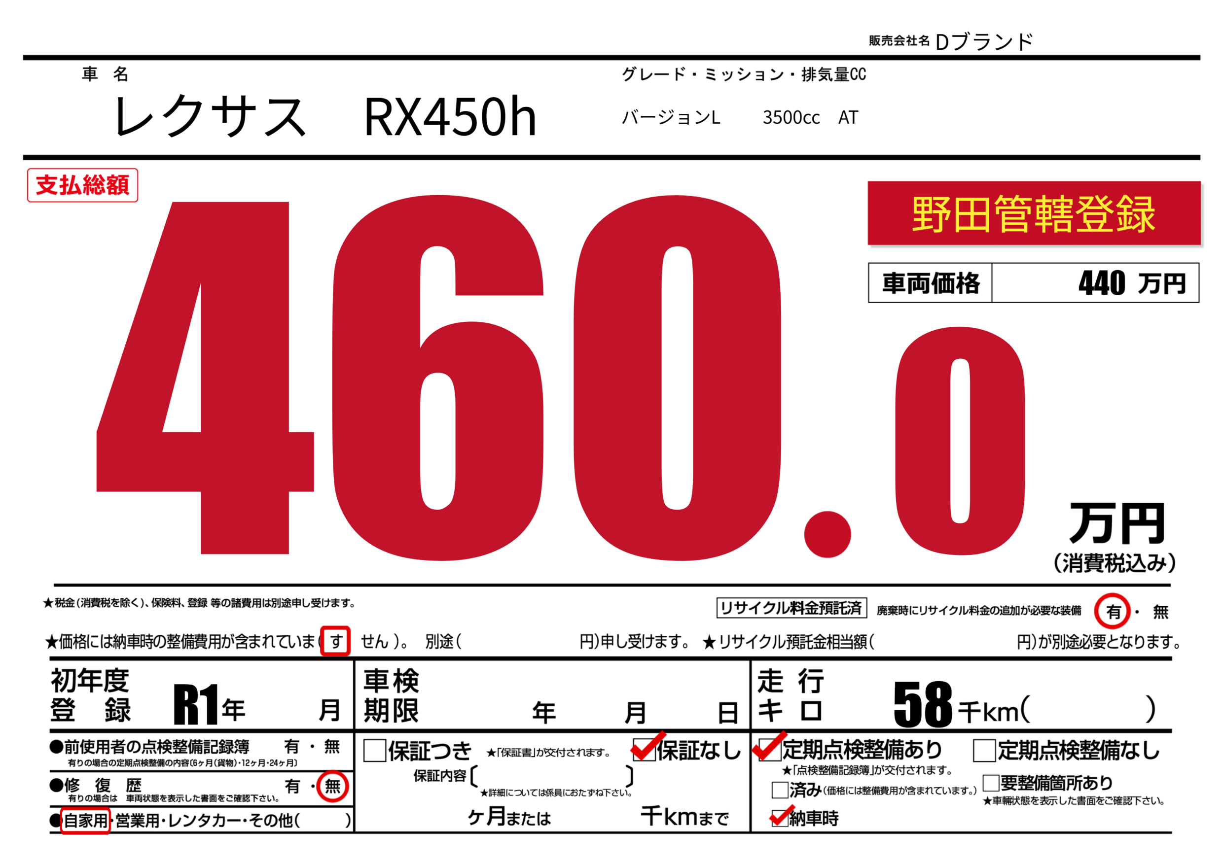 | 車名 | レクサス RX450h | グレード ミッション 排気量 |