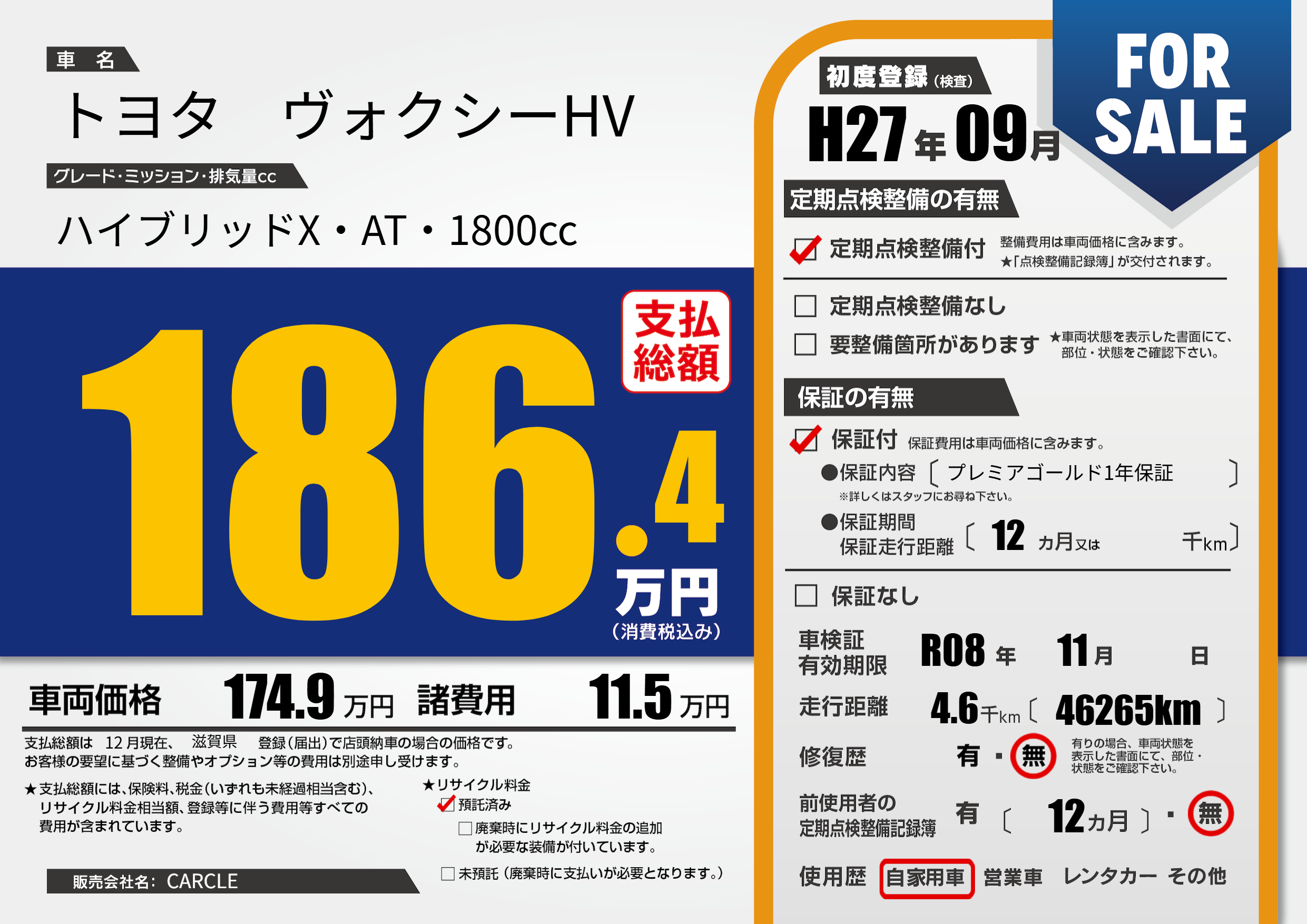| 車名 | トヨタ ヴォクシーHV | グレード ミッション 排気量 |