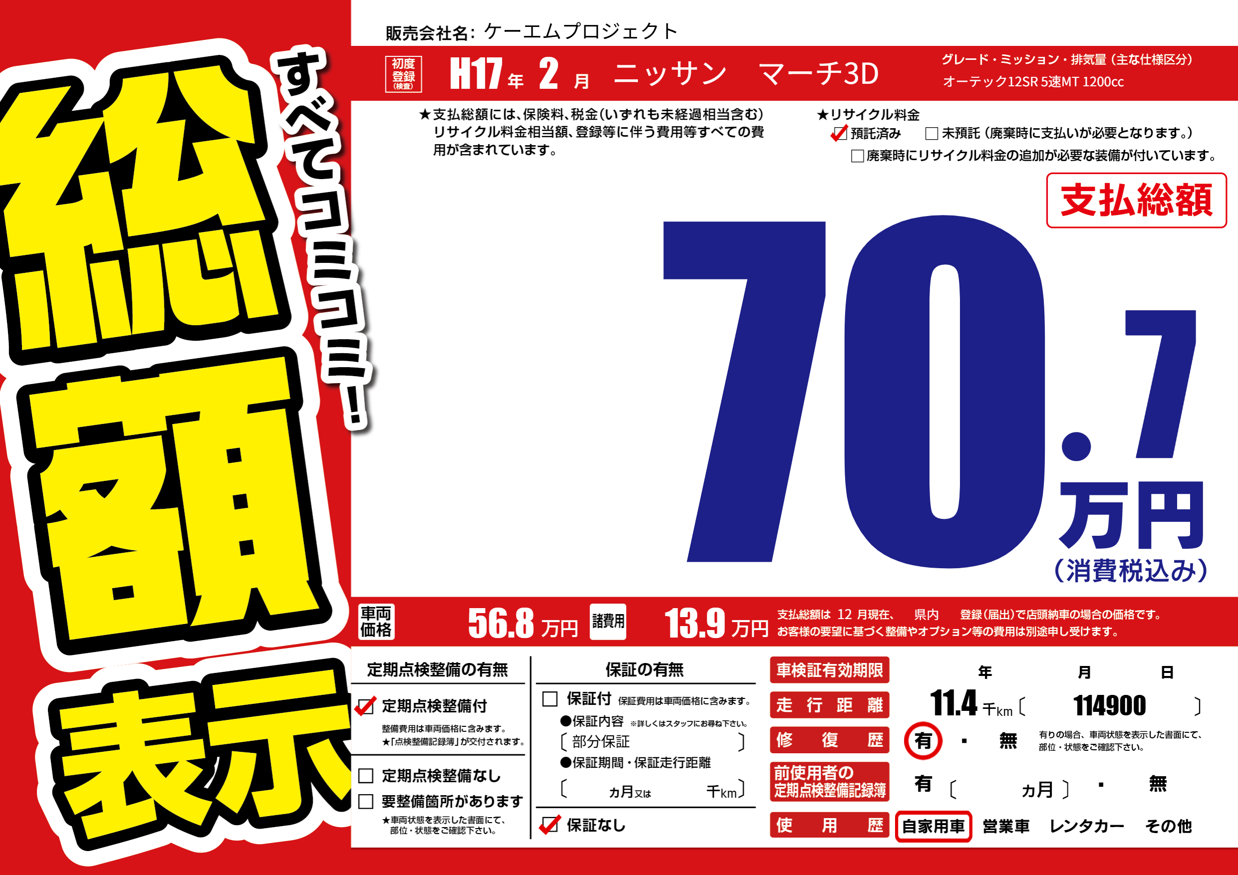 | 車名 | ニッサン マーチ3D | グレード ミッション 排気量 |