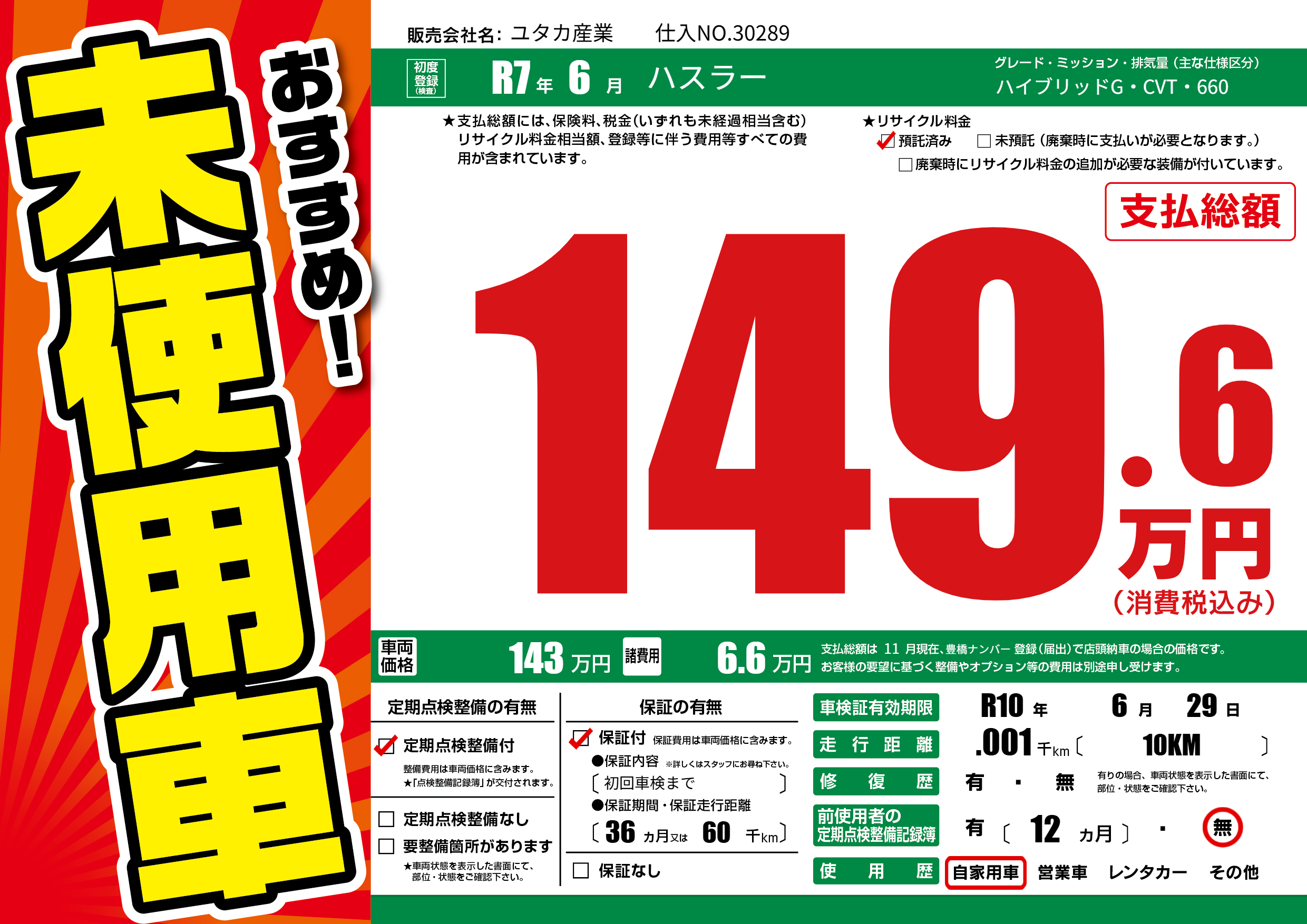 | 走行キロ | - | 初年度登録 | R7年6月 |