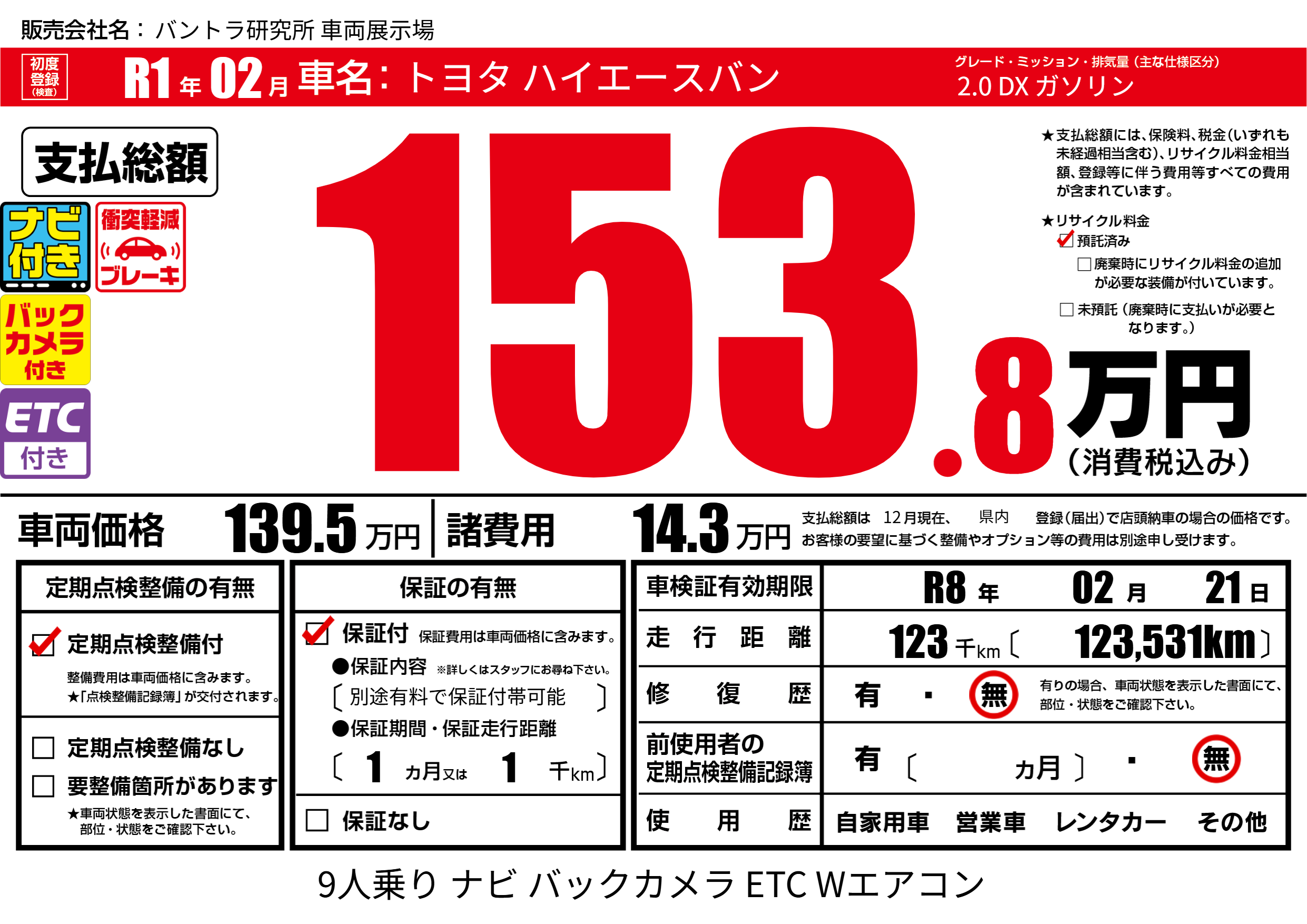 | 車名 | トヨタ ハイエースバン | グレード ミッション 排気量 |
