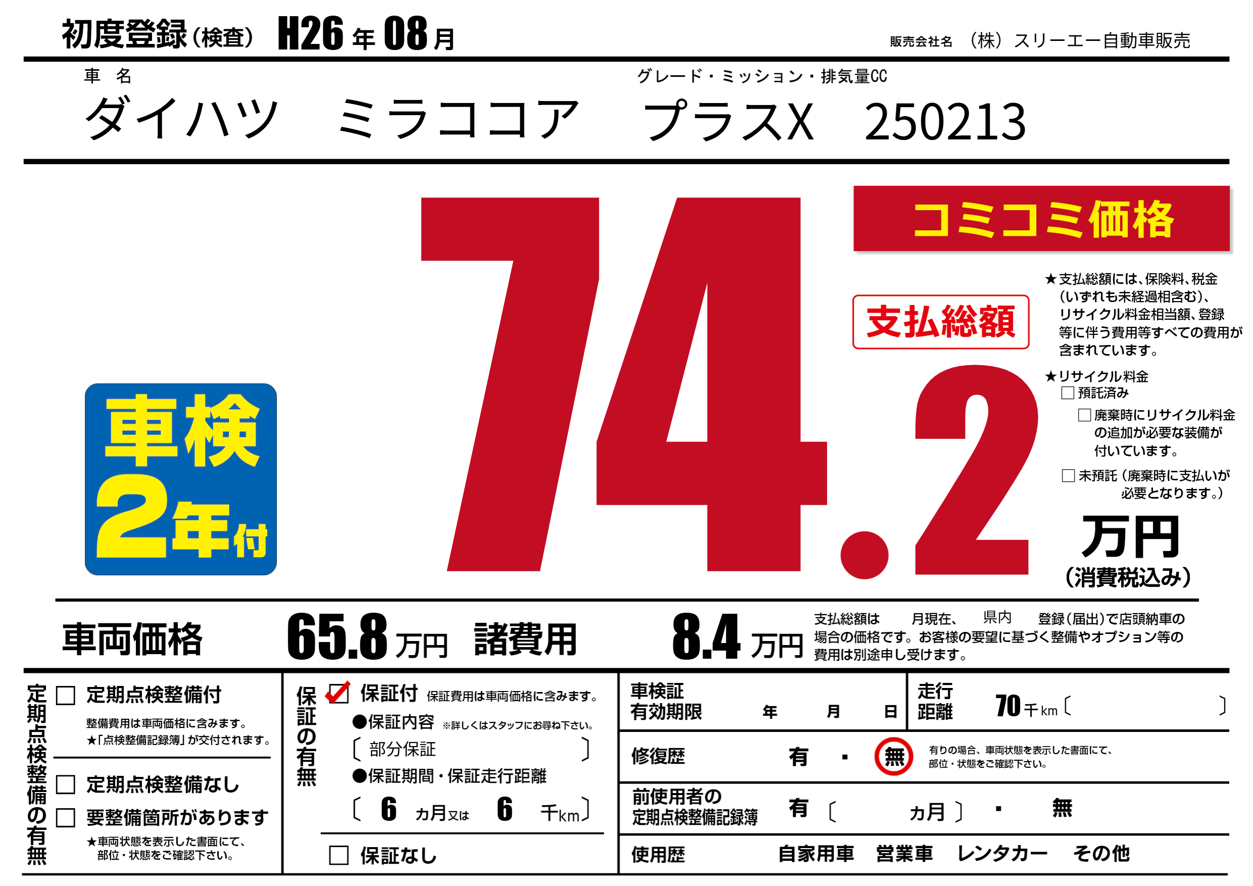 | 走行キロ | 7万km | 初年度登録 | H26年08月 |