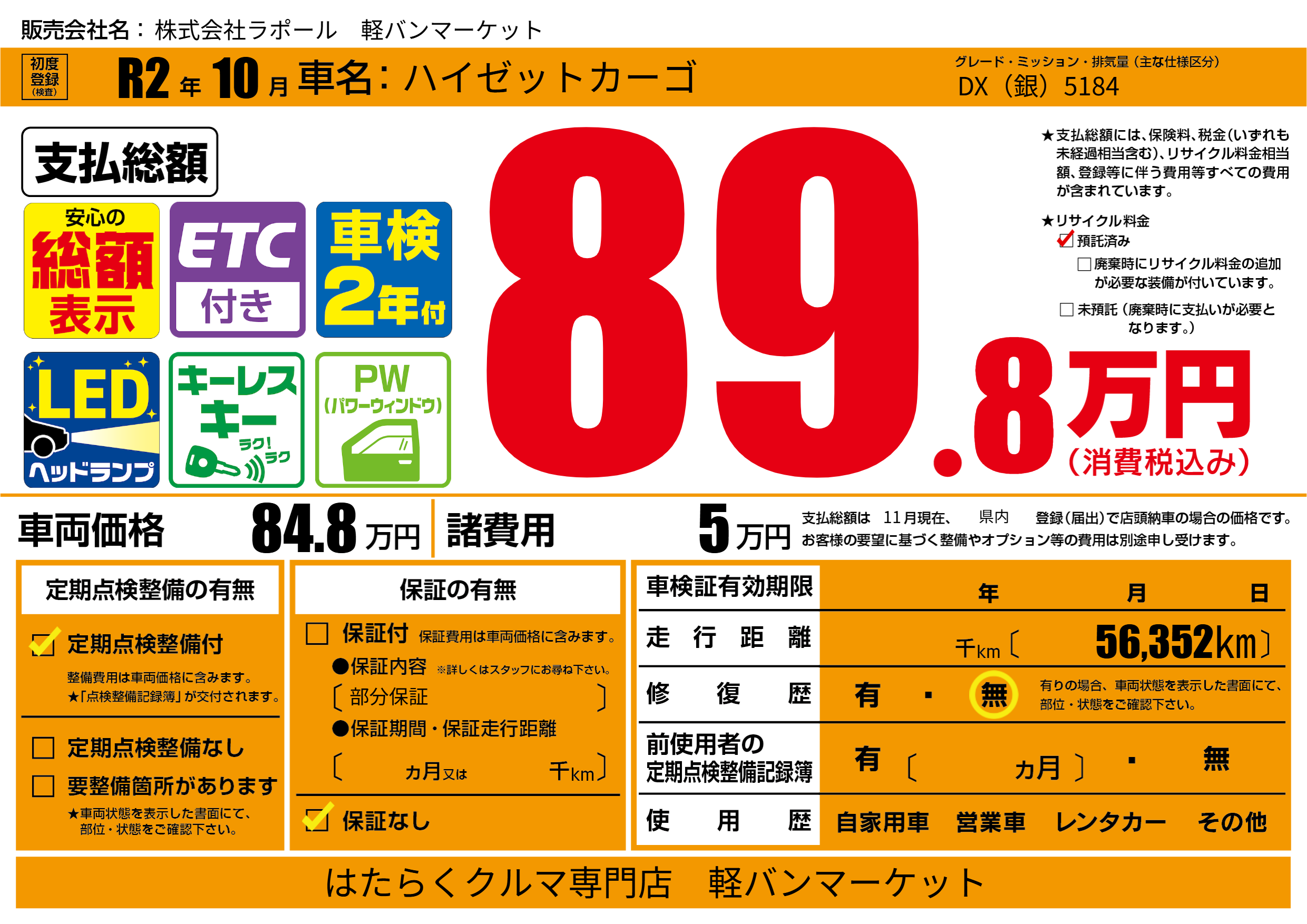 保証なし 保証内容(部分保証) ---ヶ月または()千kmまで |