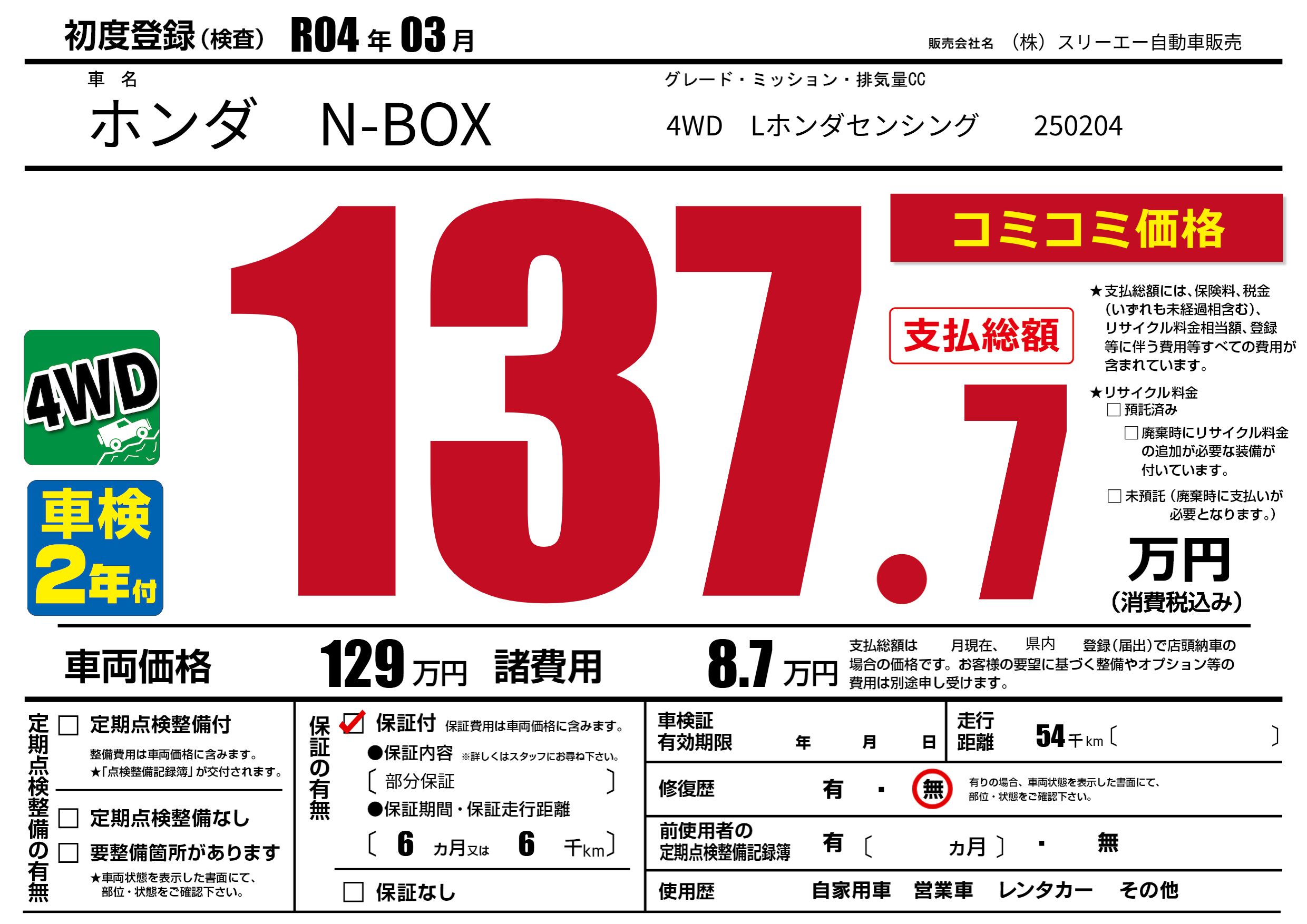保証付き 保証内容(部分保証) 6ヶ月または(6)千kmまで |