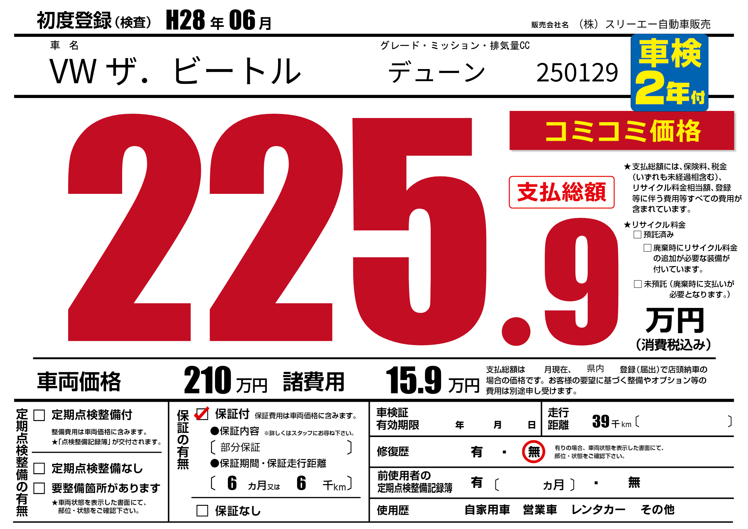| 車名 | VW ザ.ビートル | グレード ミッション 排気量 |