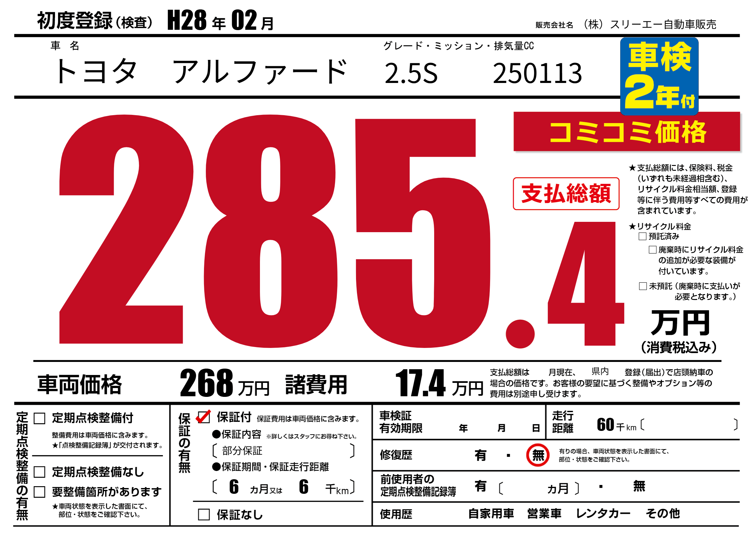 | 車名 | トヨタ アルファード | グレード ミッション 排気量 |