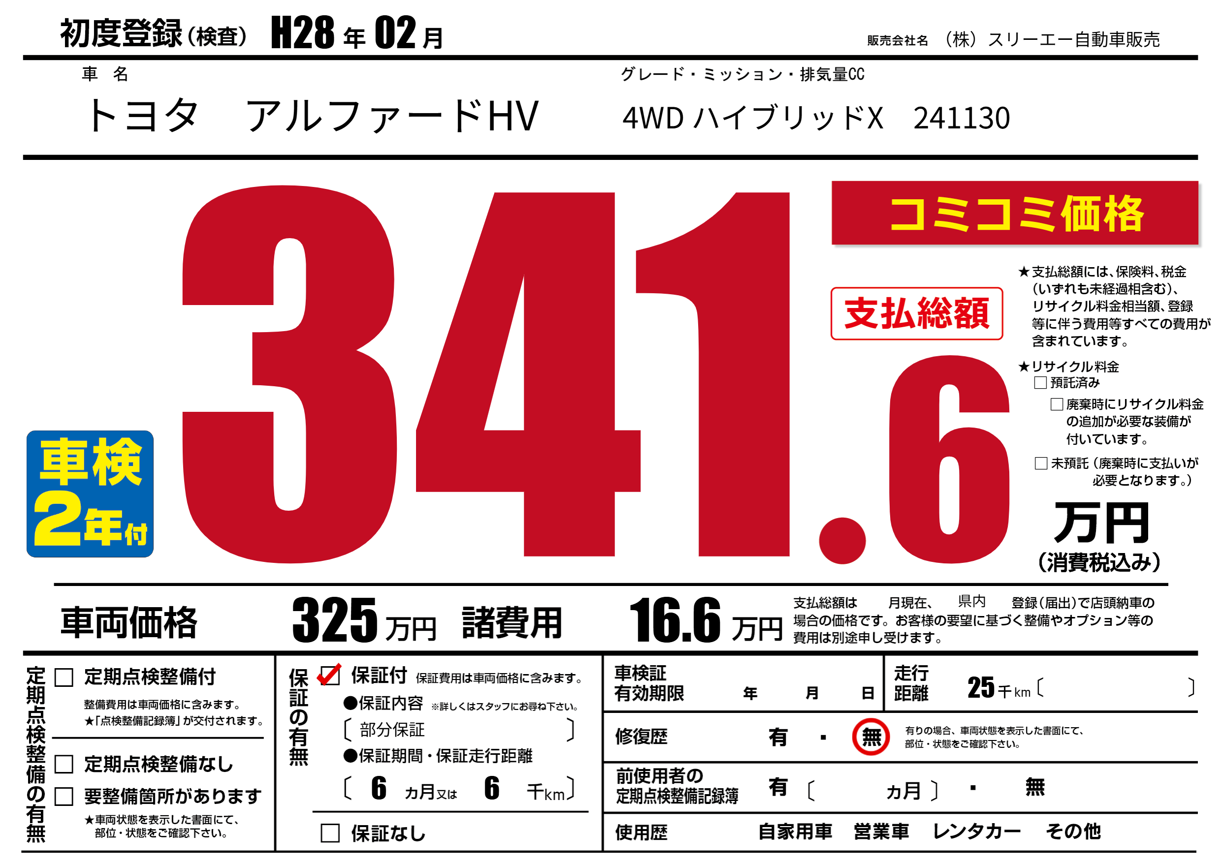 | 車名 | トヨタ アルファードHV | グレード ミッション 排気量 |