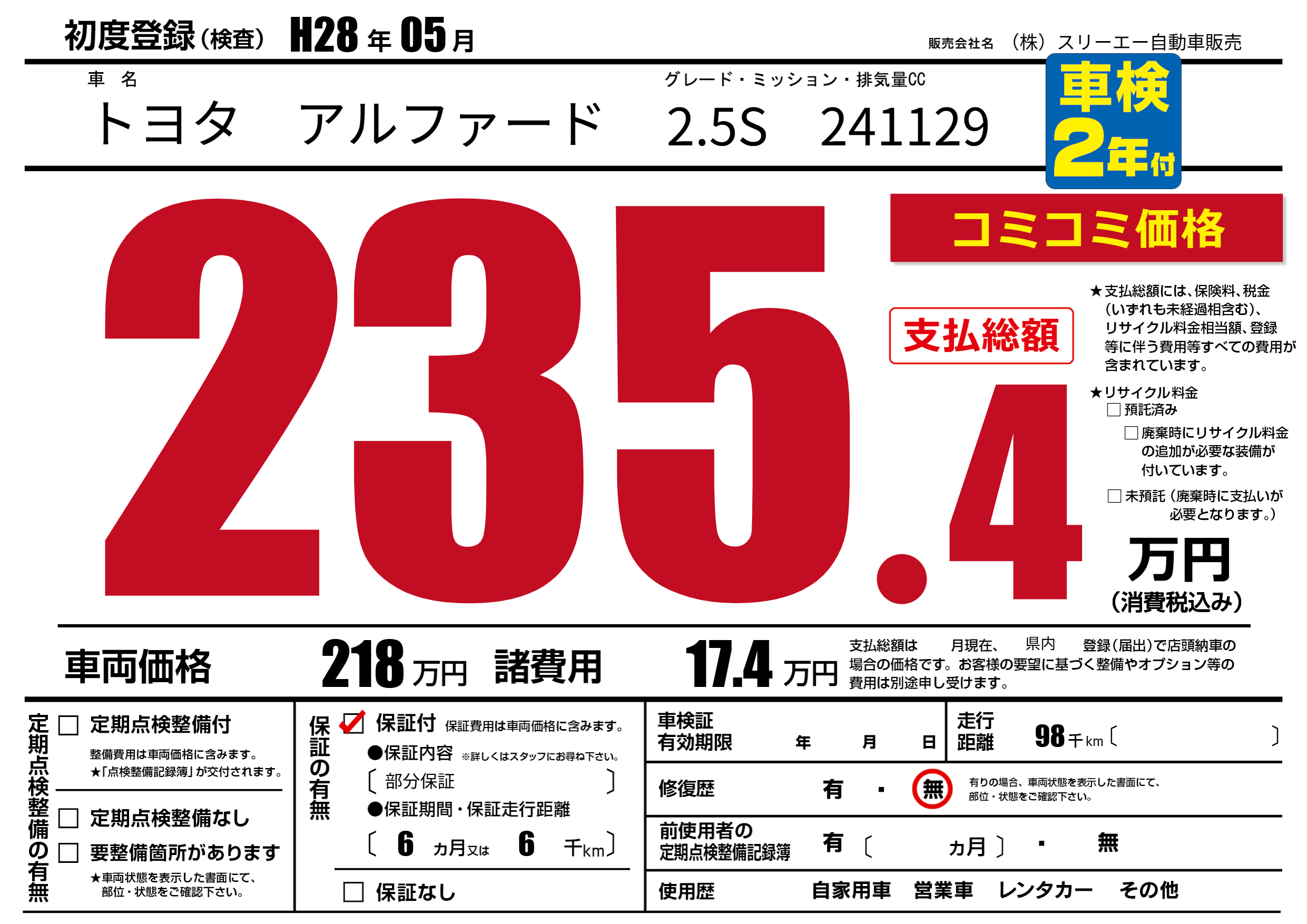 | 車名 | トヨタ アルファード | グレード ミッション 排気量 |