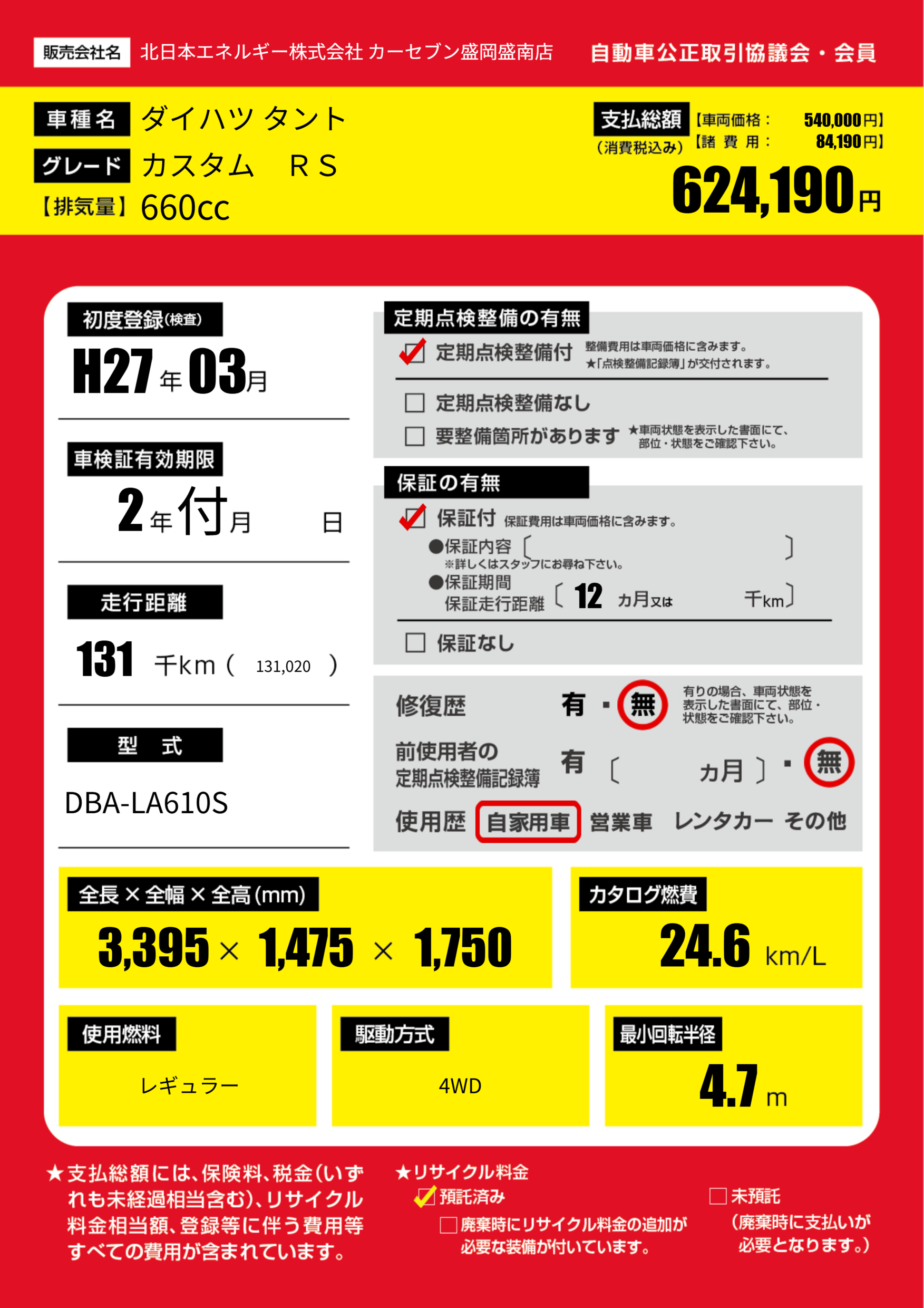 | 車名 | ダイハツ タント | グレード ミッション 排気量 |