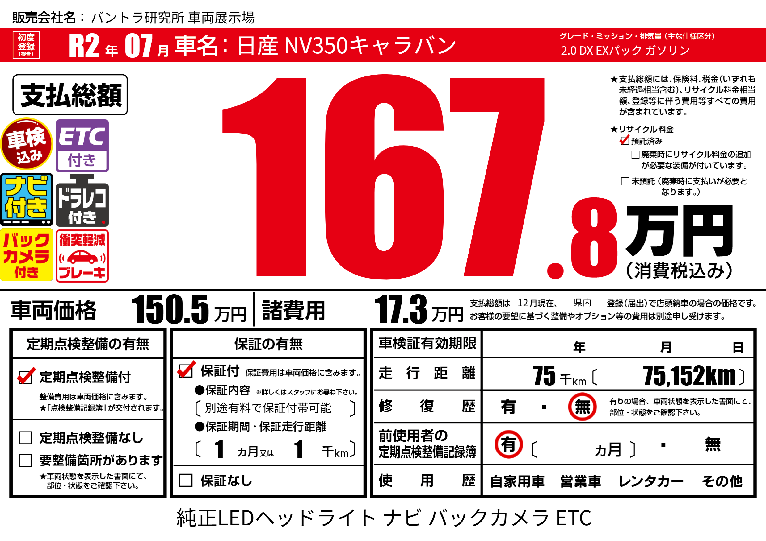 | 走行キロ | 7.5万km | 初年度登録 | R2年07月 |